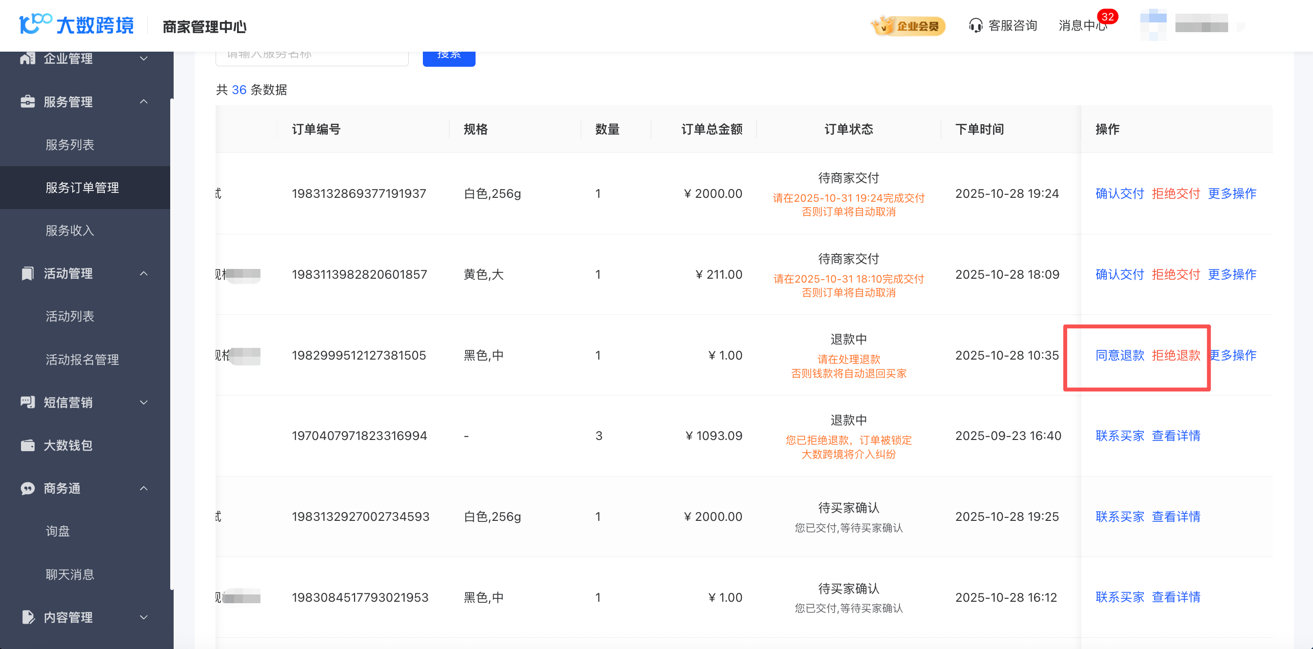 确认路径:商家后台【服务订单列表】服务【订单操作】-【同意退款】/【拒绝退款】
