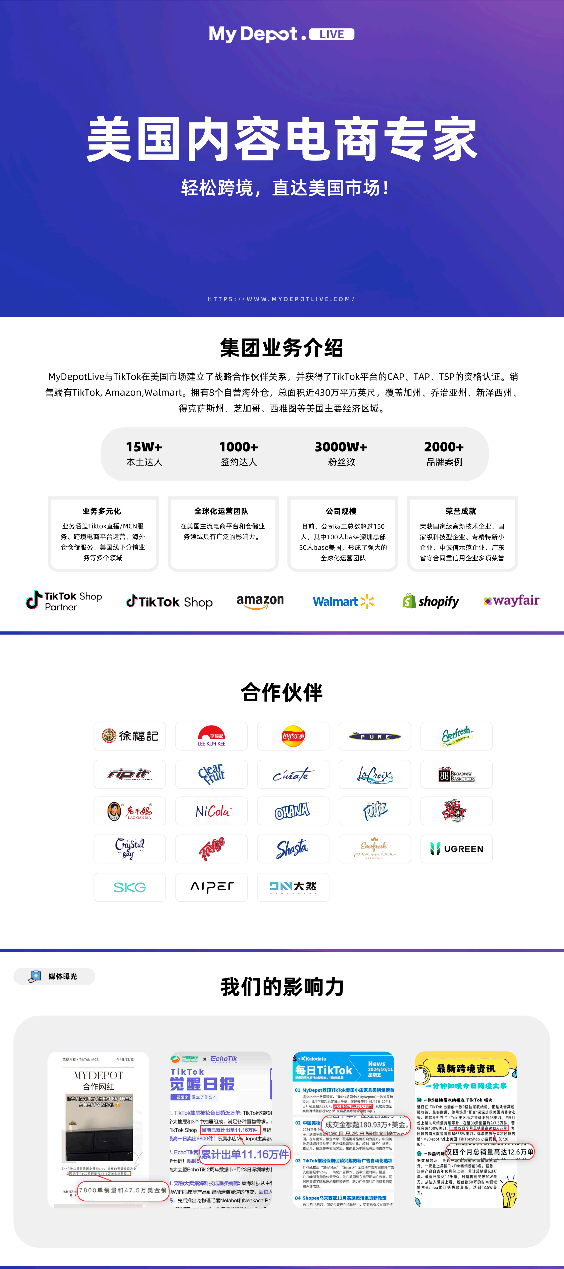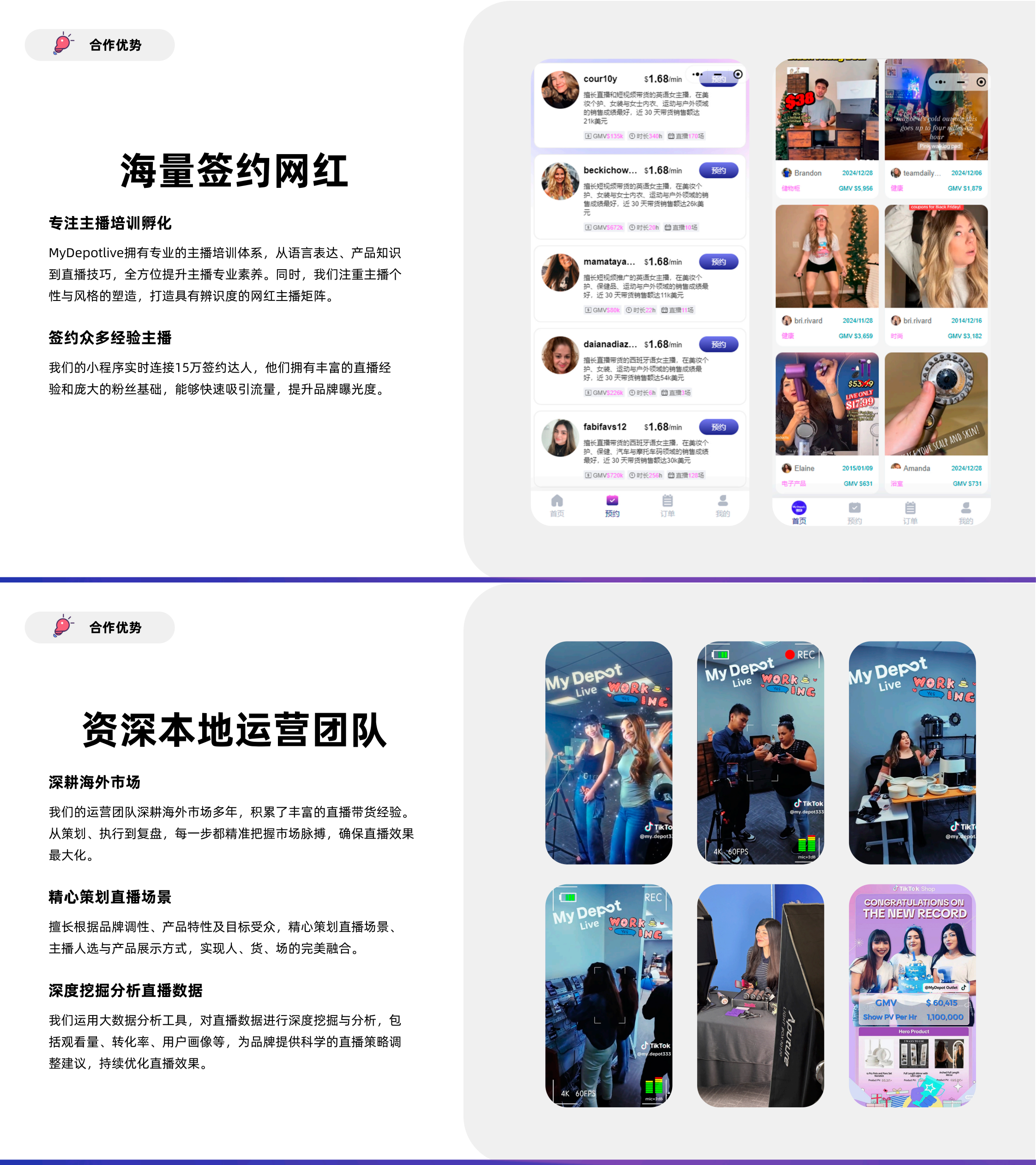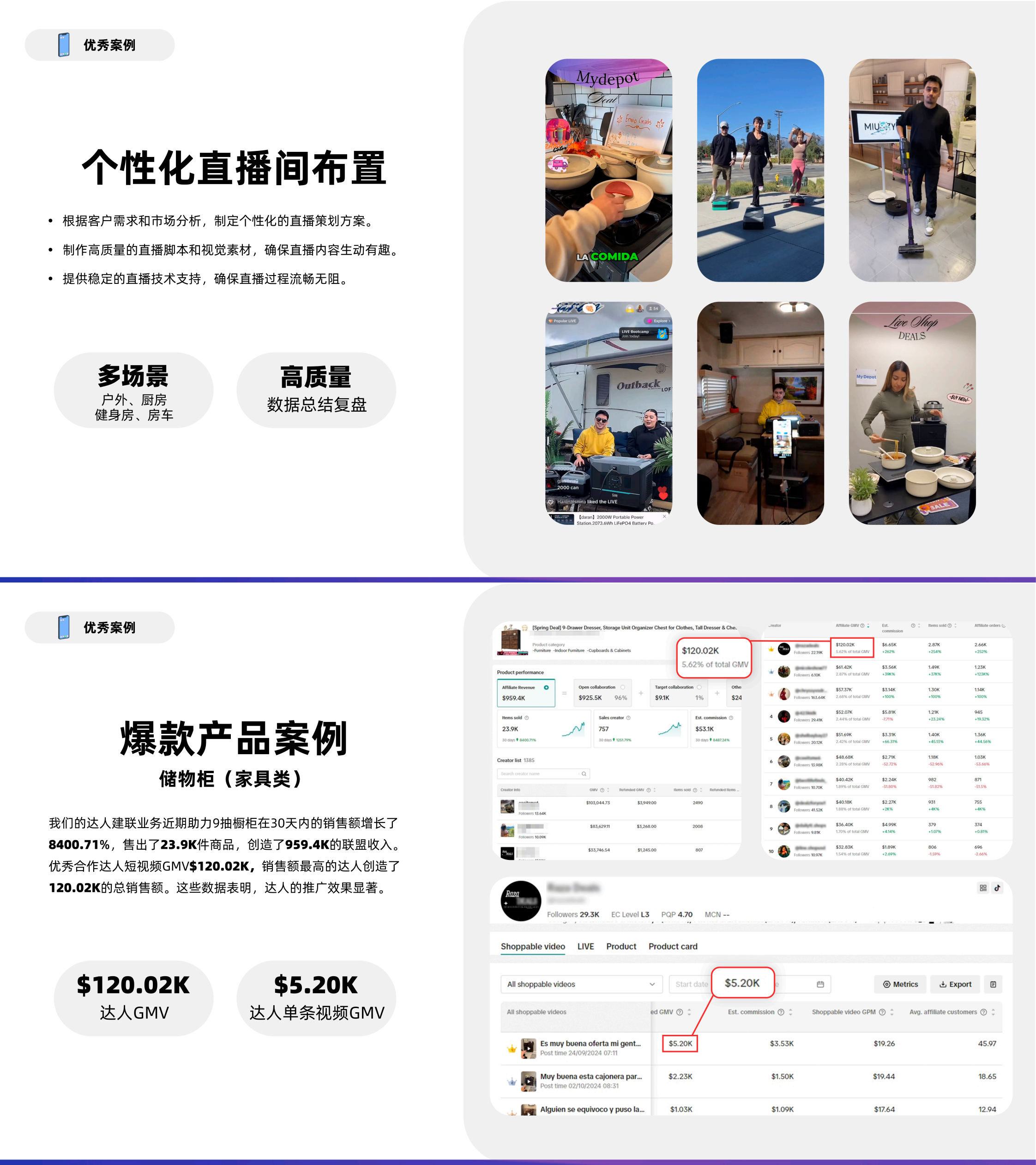 达人建联:依需求打造脚本,匹配垂直领域达人;直播带货:本土主播代播,定制化直播间;店铺代运营:全链路运营,爆品冷启动