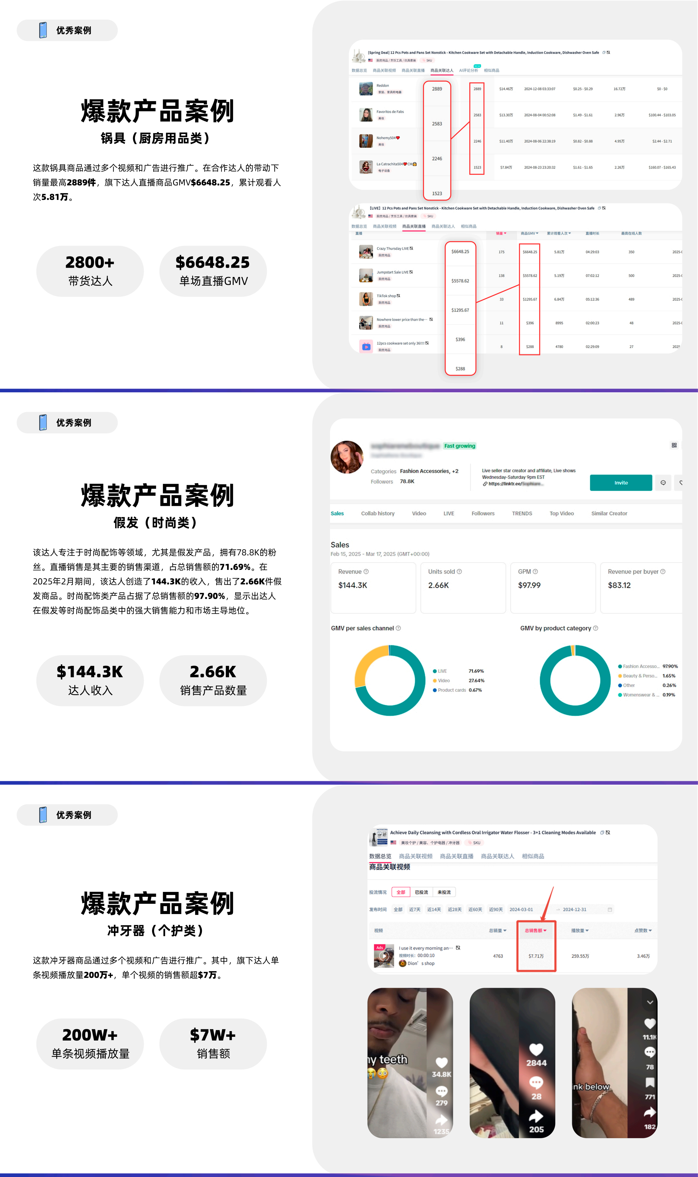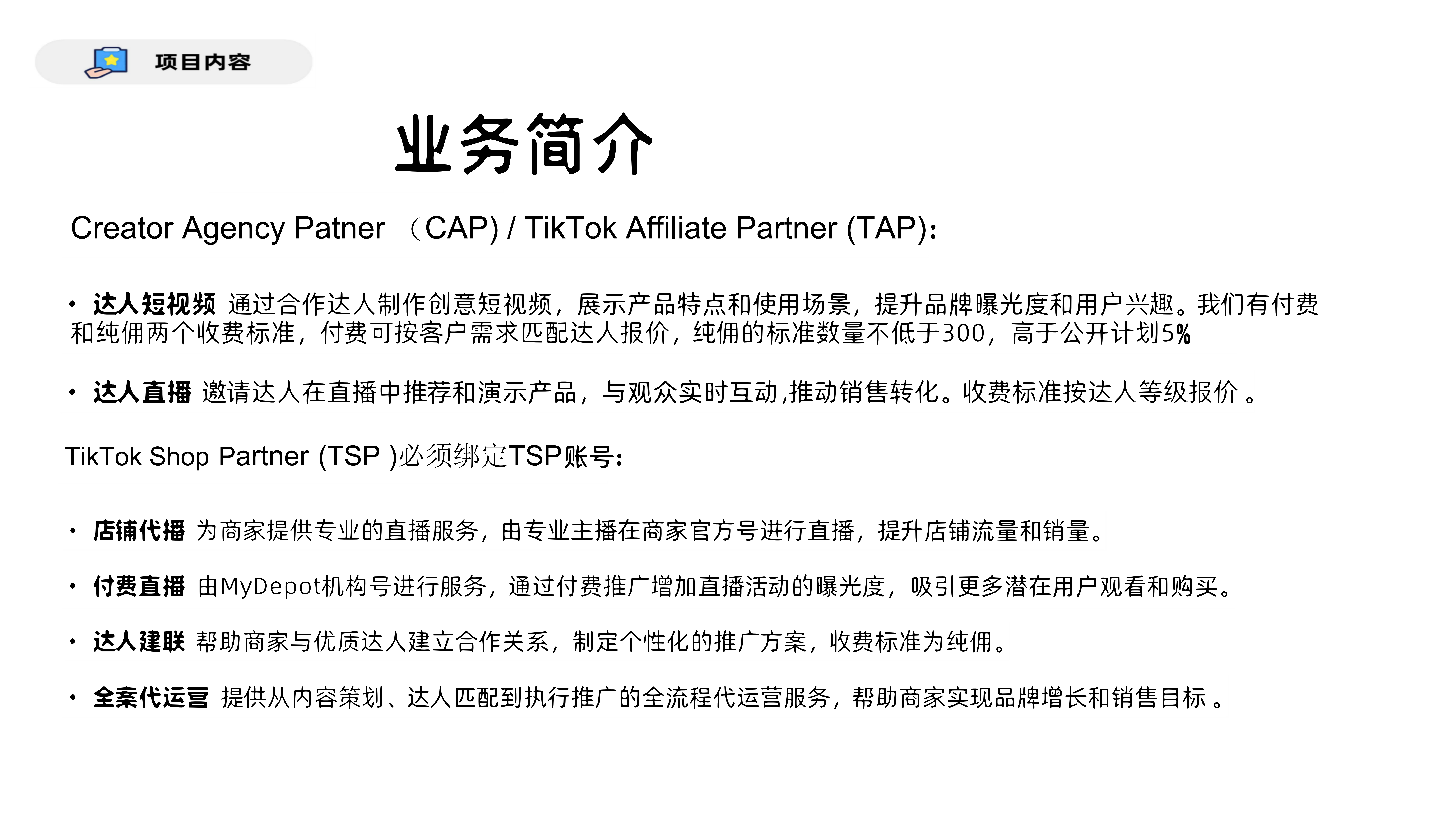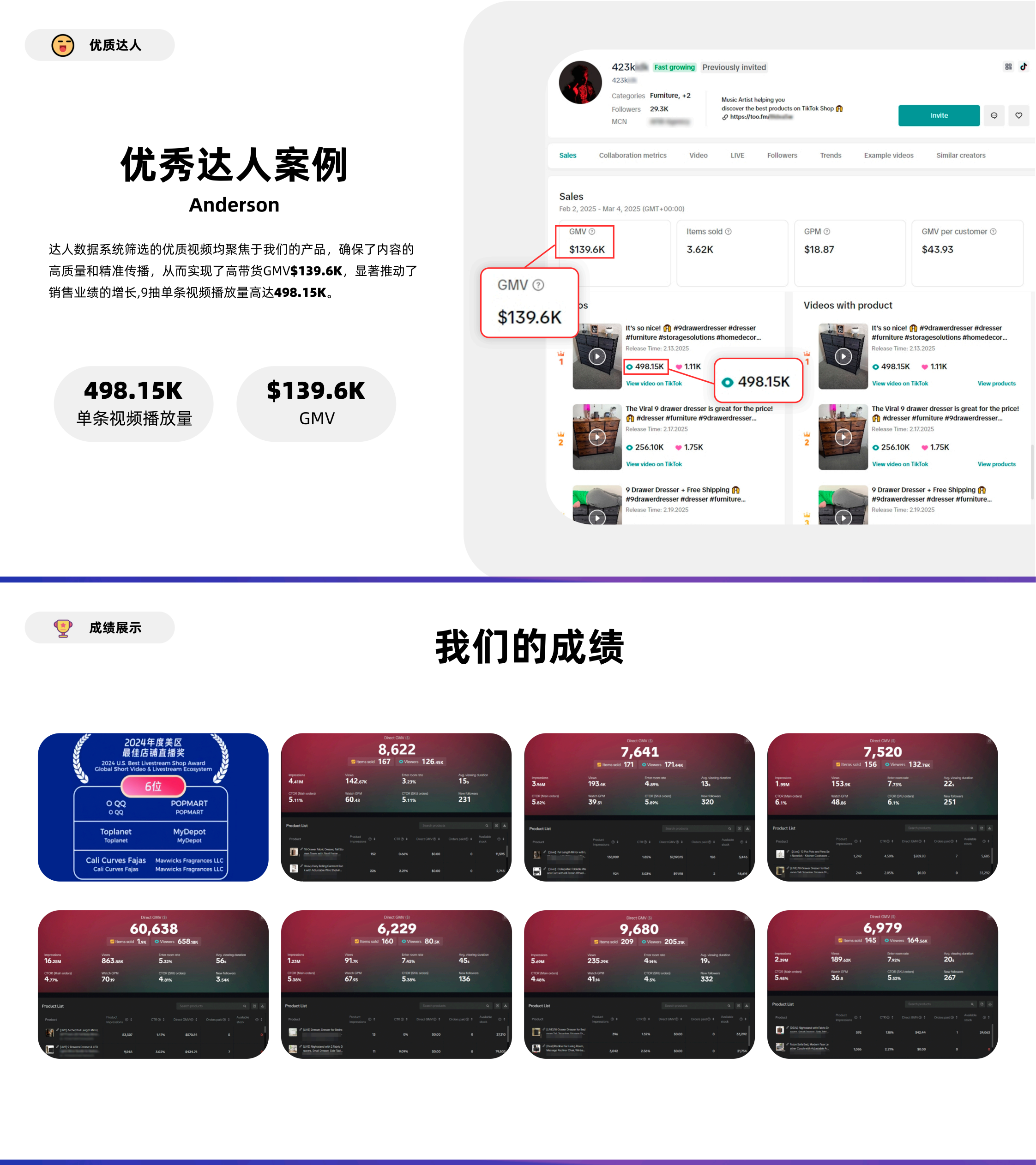 达人建联:依需求打造脚本,匹配垂直领域达人;直播带货:本土主播代播,定制化直播间;店铺代运营:全链路运营,爆品冷启动