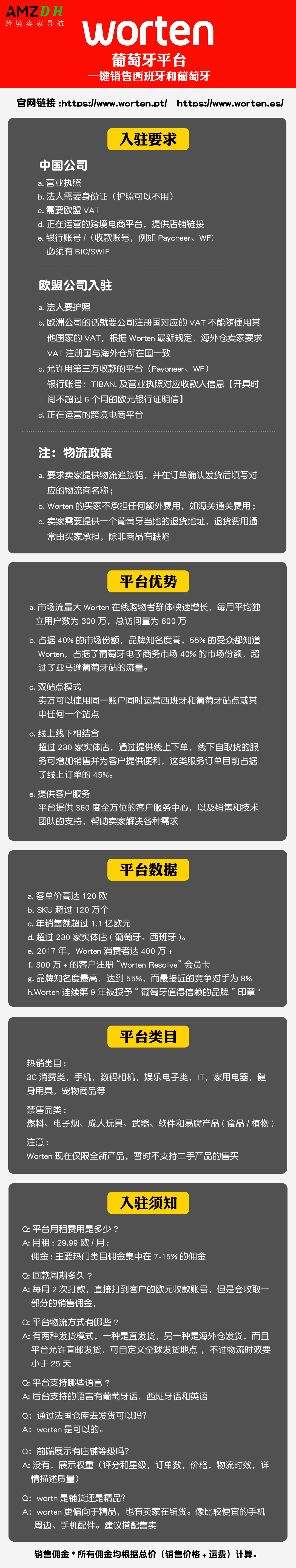 ✔AMZDH提供平台代入驻及下店后的运营扶持;✔Worten定位为综合性电子产品零售商,商品涵盖手机、3C数码、家电等超过230万个SKU;✔葡萄牙站点用户超500万,西班牙站点用户超500万,总覆盖人口超1000万;✔葡萄牙月访问量1000万,西班牙月访问量150w,月总访问量1150万次;✔平台全面支持市面主流第三方收款平台回款