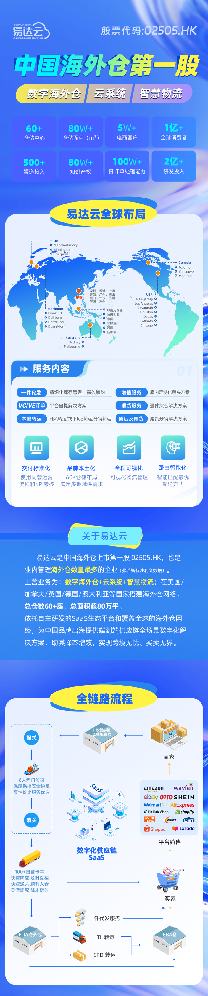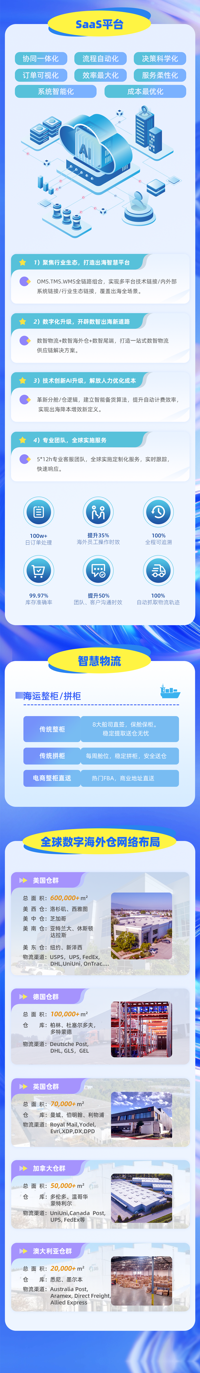 全球化:在美/加/英/德/澳等国家布局海外仓60+座,总面积超80W平;科技化:系统自研,累计研发投入2亿+,覆盖跨境电商全场景,全流程智能化可视化;综合化:支持大/中/小件各类出海产品,尤其标准件和重货优势明显;合规化:全流程合法合规,秉持阳光出海