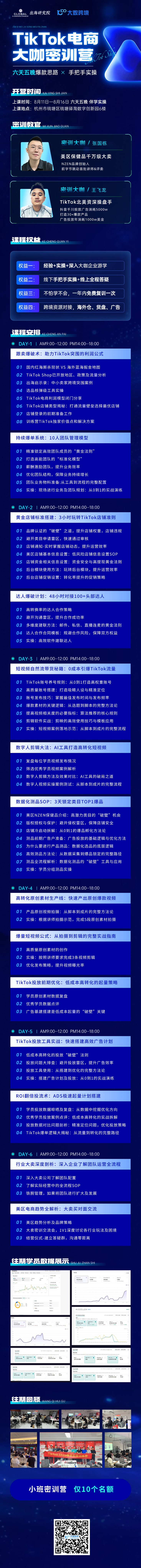 现在报名,立享大数专属渠道优惠价格;十人小班,经验+实操+深入大咖企业游学;线下手把手实操+线上全程答疑;不怕学不会,一年内免费复训一次;跨境资源对接,海外仓、货盘、广告