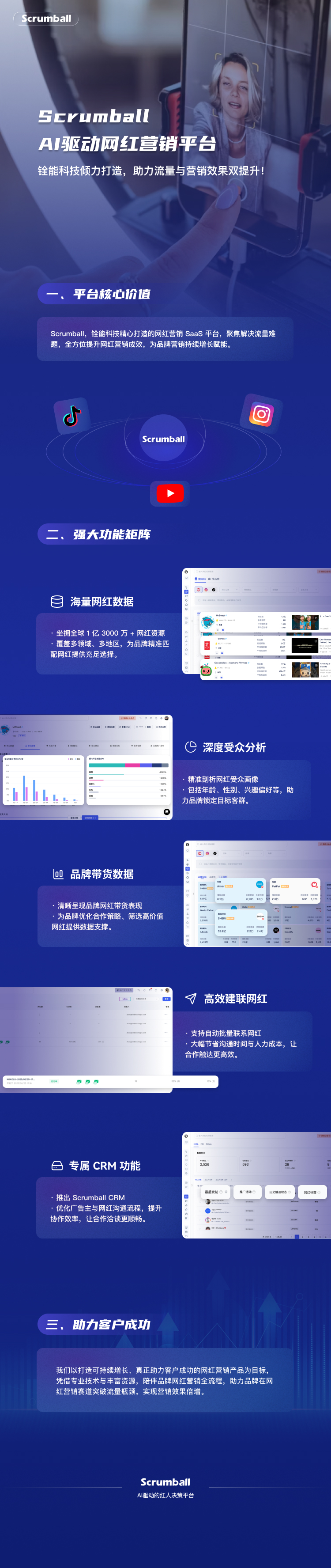 覆盖 1300万 + 全球红人,YouTube,IG,TikTok三大平台全囊括;多维度筛选,精准匹配目标受众;解析竞品红人策略,借鉴优质合作案例;自动化邮件触达,高效跟进红人资源;全流程 CRM 管理,红人合作一站把控