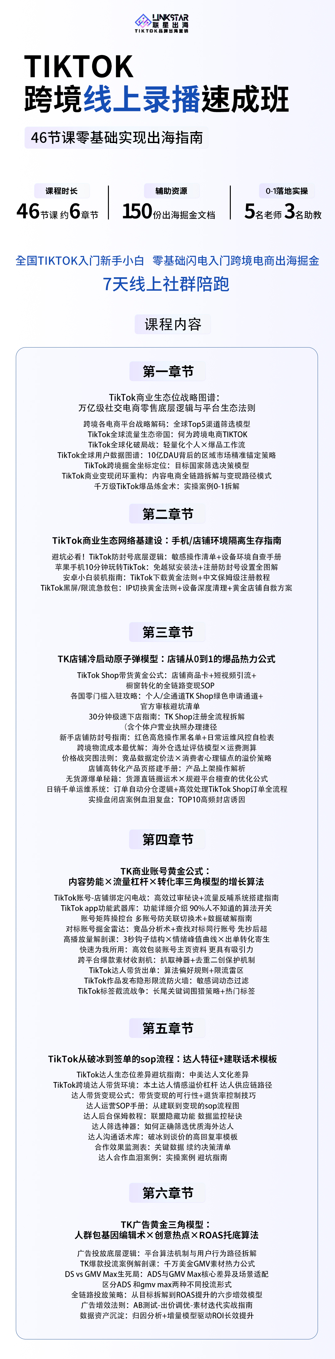 全国TIKTOK入门新手小白;零基础闪电入门跨境电商出海掘金;7天线上社群陪跑;46节课零基础实现出海指南