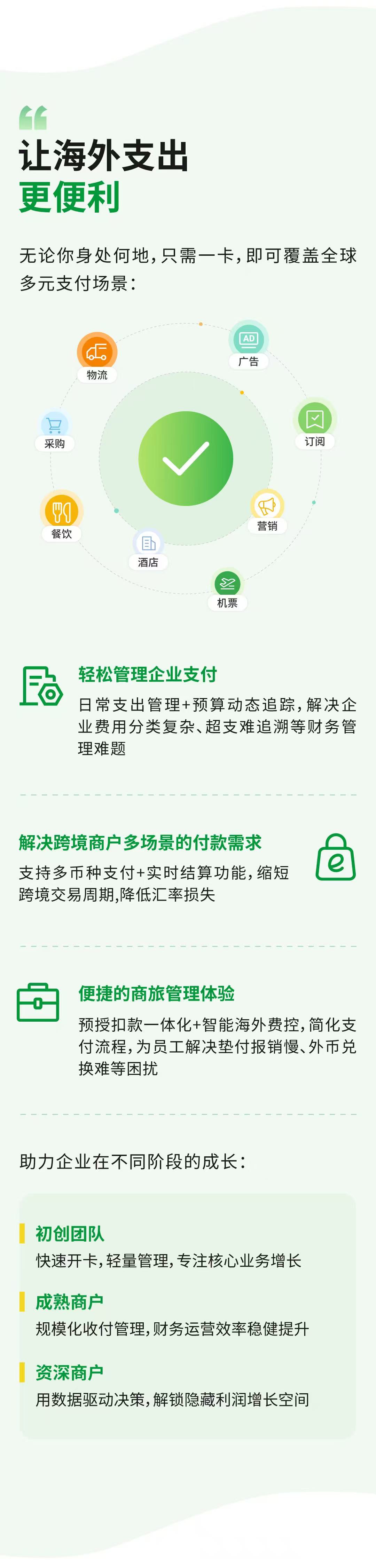 支付场景全覆盖。广告投放;物流仓储;OTA;平台店租;货品采购;等多种付款场景需要。