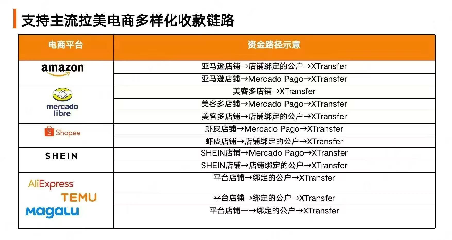 支持主流拉美本土电商回款:Amazon、美客多、虾皮、SHEIN、速卖通、TEMU、Magalu
