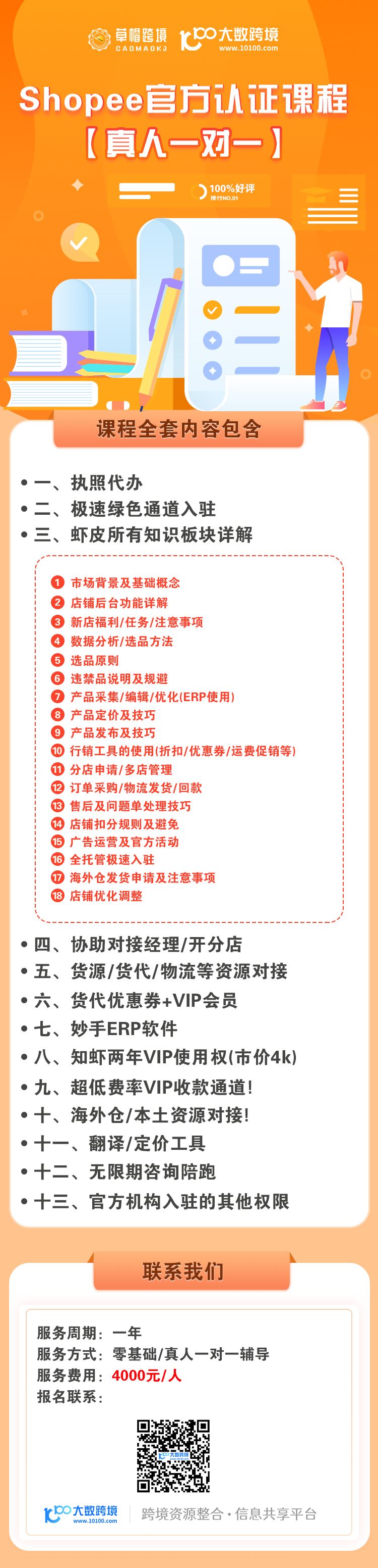 真人一对一全程辅导;覆盖开店全流程知识与资源;配备实用工具(妙手 ERP、知虾等)及优惠权益;助力高效开店(极速入驻、多店管理);官方机构资源支持,权益丰富