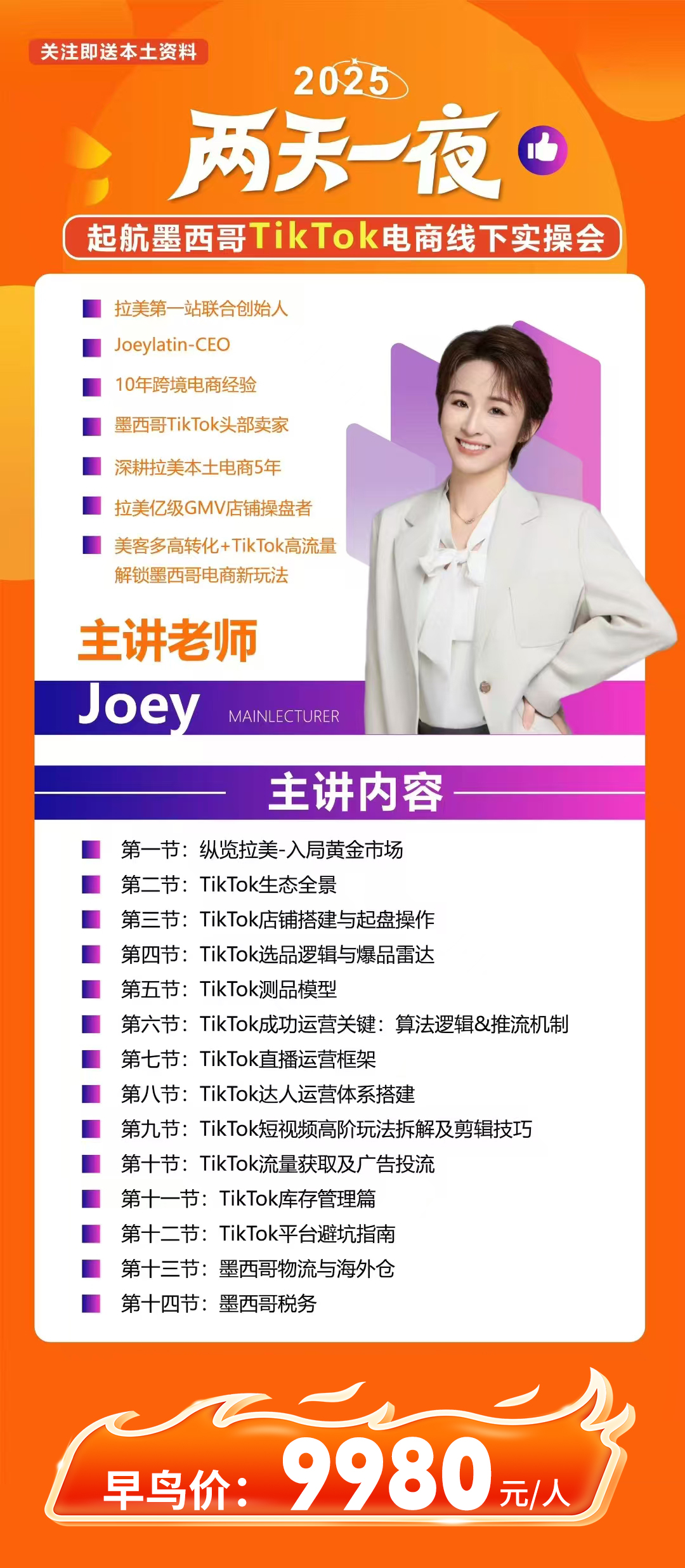 美客多高转化+TikTok高流量,解锁墨西哥电商新玩法;线下实操课,手把手演示后台设置、运营、优化全流程;揭秘大卖后台,分享大卖货盘,复刻爆单店铺;拉美&南美、墨西哥、巴西