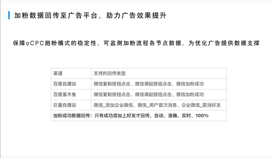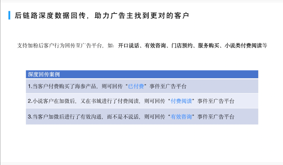 减少广告流量的流失,做最短的加粉路径;筛选高意向客户,做最有效的加粉路径;监测客户广告来源,将流量价值最大化;加粉数据回传至广告平台,助力广告效果提升;后链路深度数据回传,助力广告主找到更对的客户