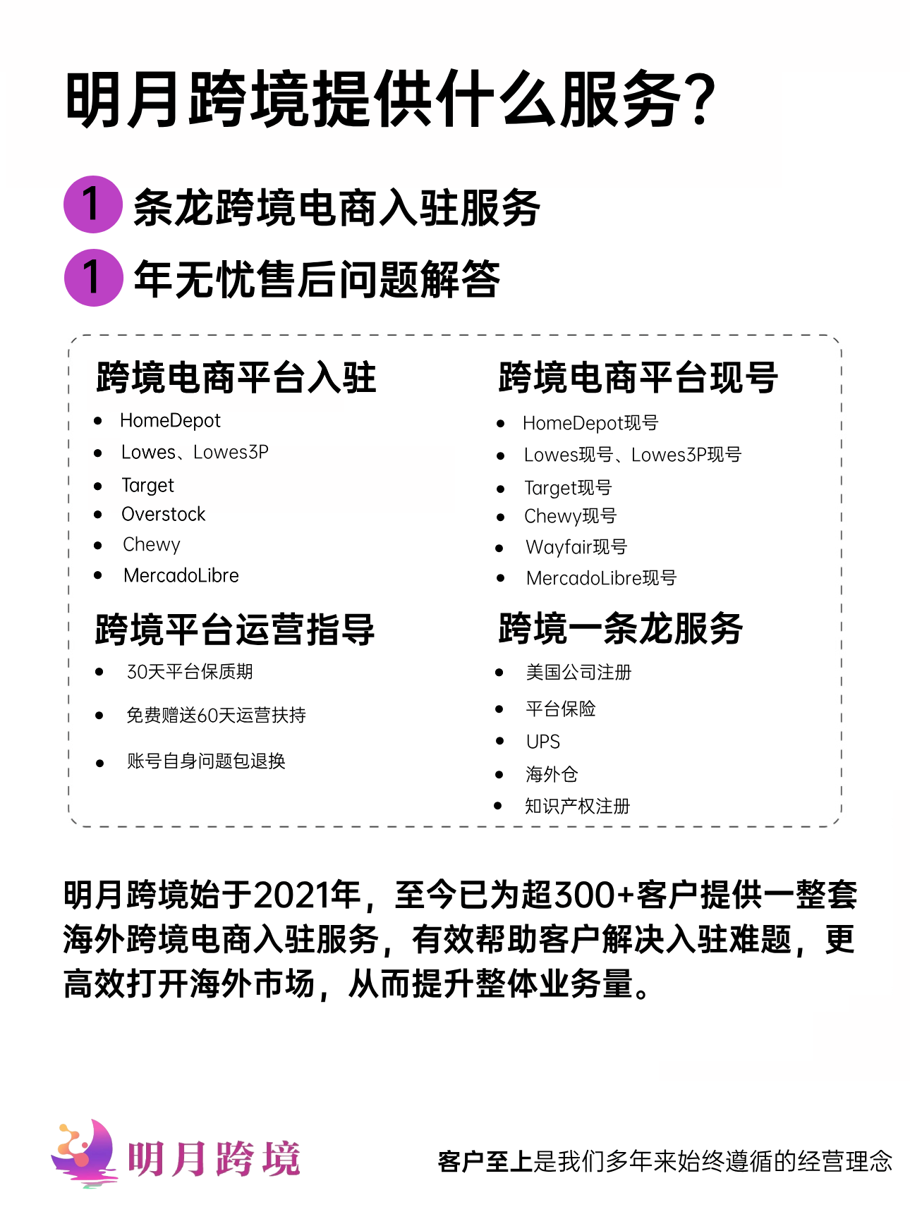 300+成功客户案例背书;一站式全包入驻;强大的北美及本土团队;运营+售后双保障;账号自身问题包退换