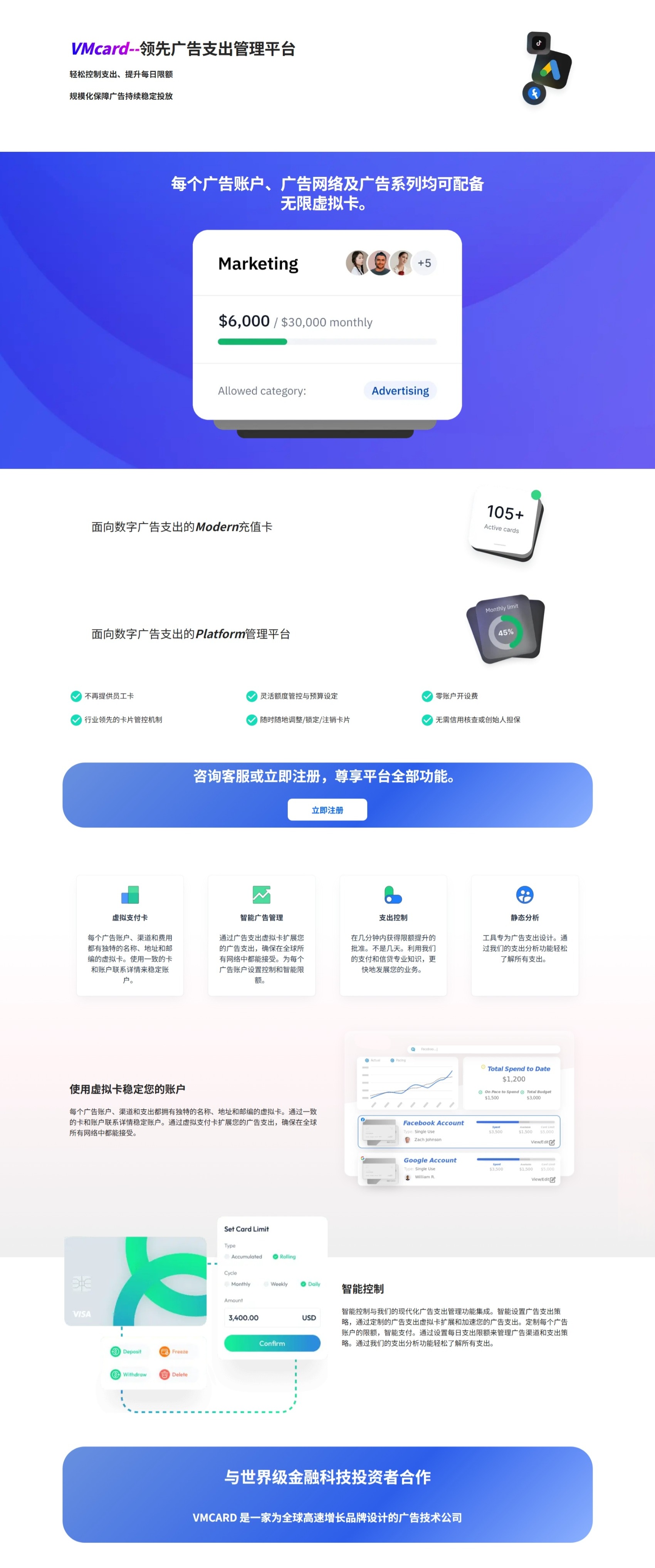 轻松控制支出、提升每日限额;规模化保障广告持续稳定投放;随时随地调整/锁定/注销卡片;无需信用核查或创始人担保