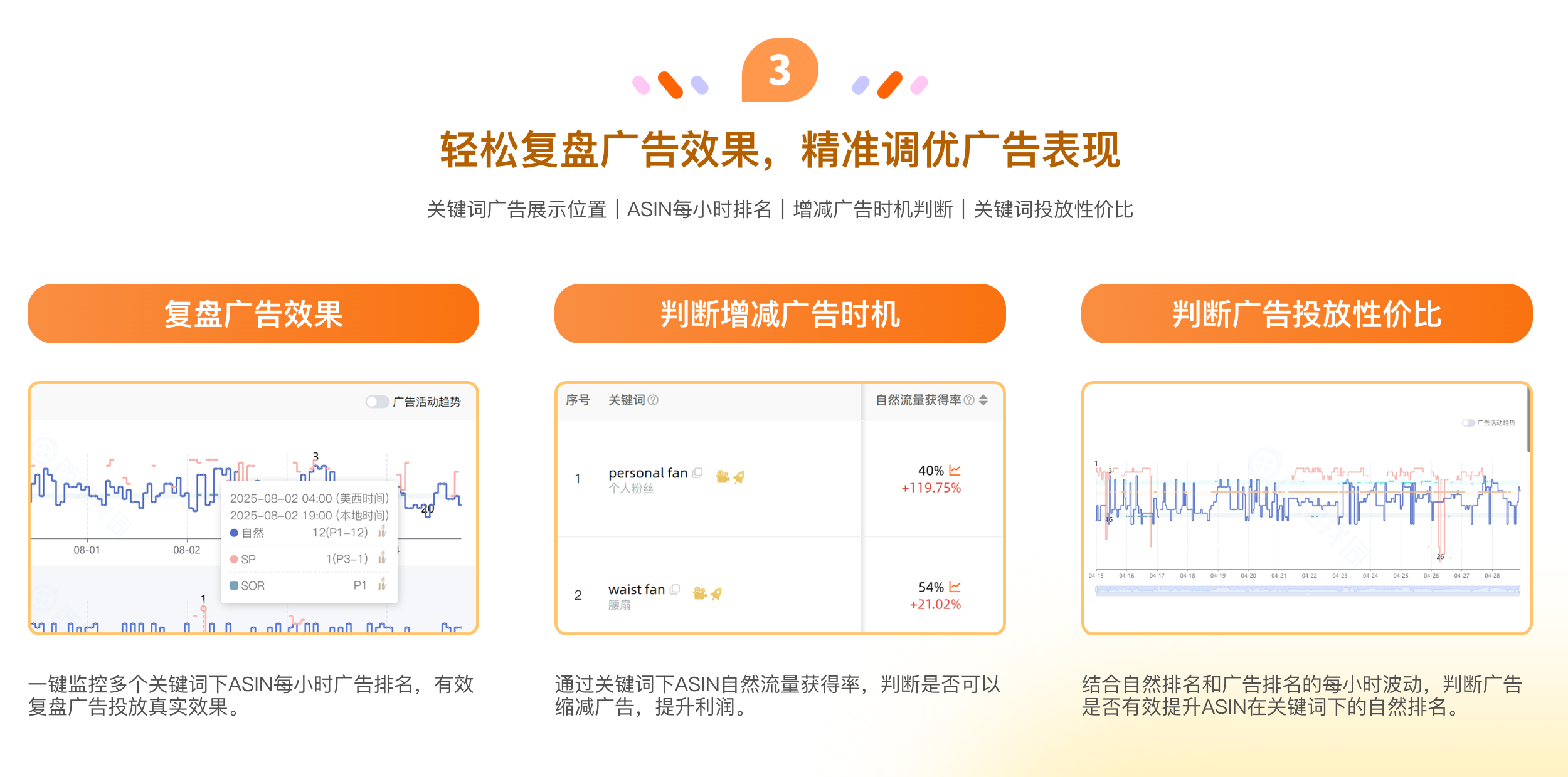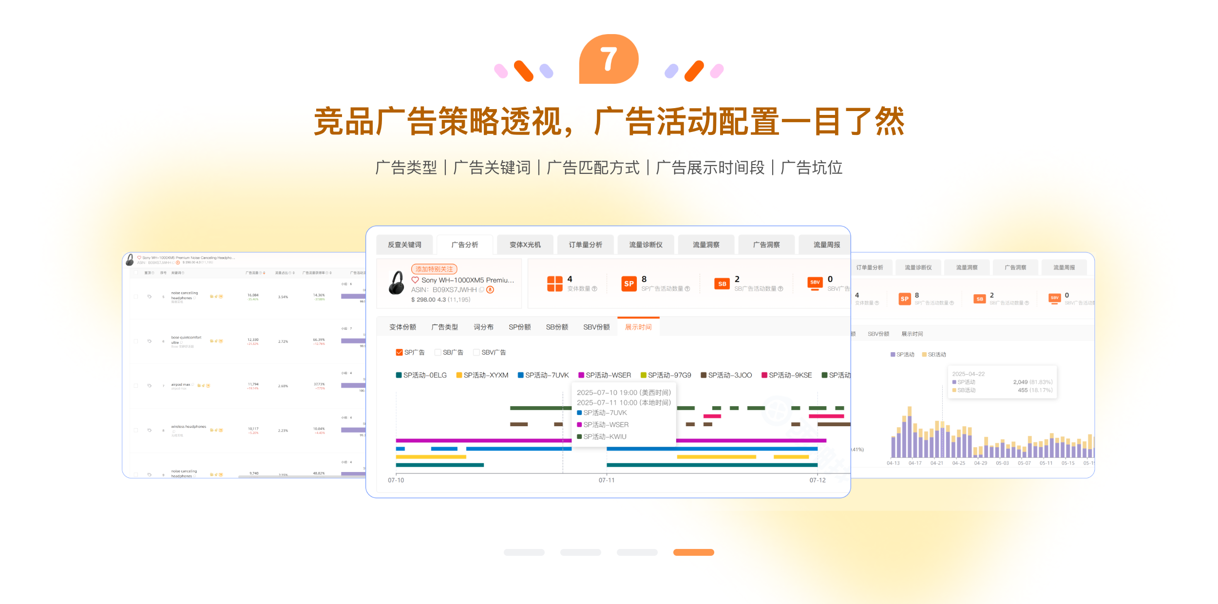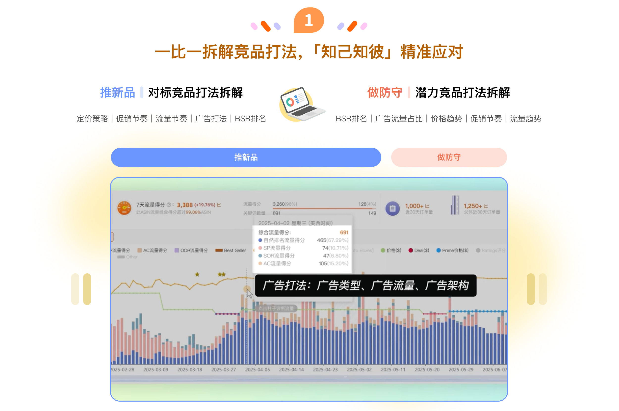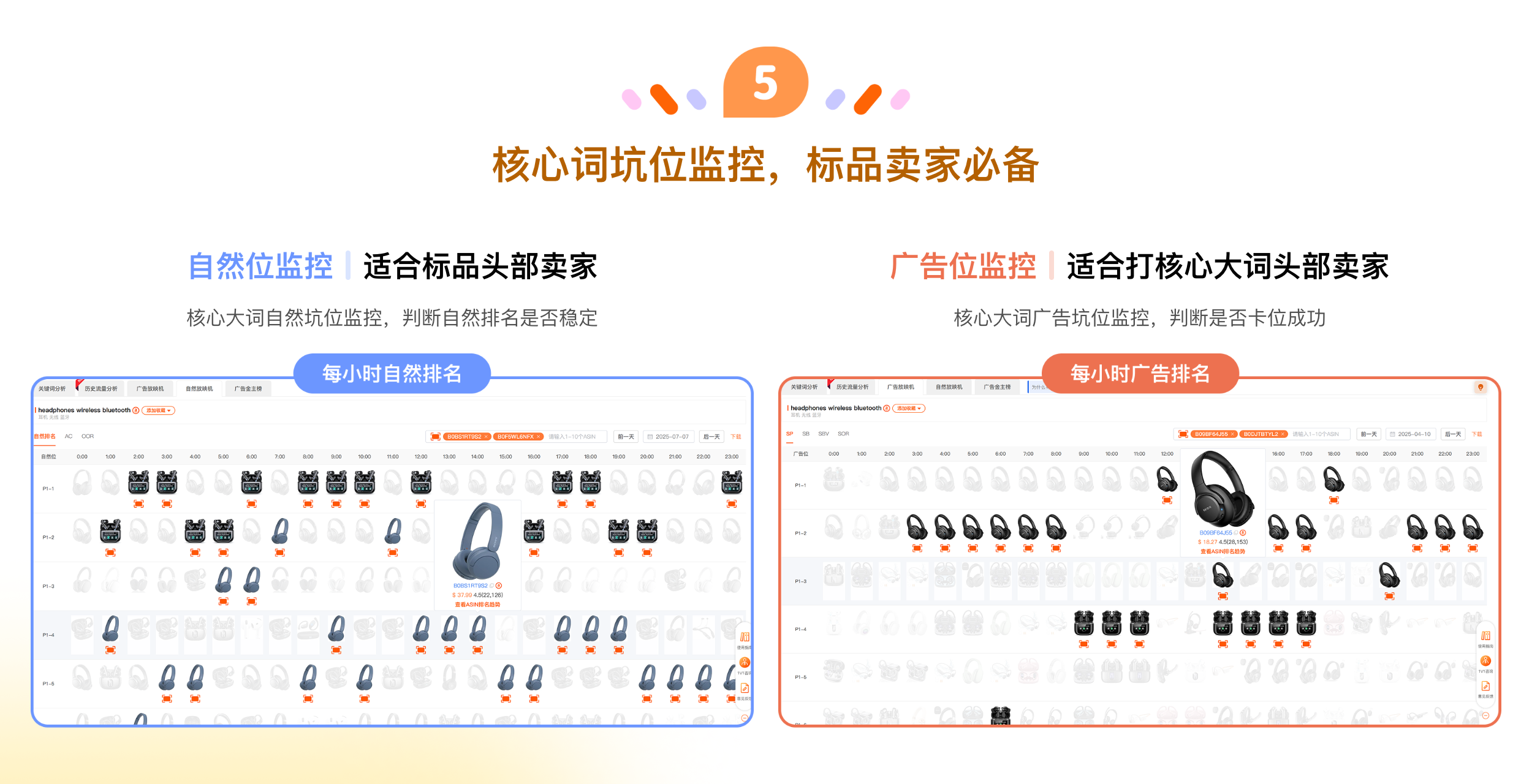拆解竞品打法,ASIN/父体流量监控,高效拓流;轻松复盘广告效果,精准调优广告表现;核心词坑位监控,标品卖家必备;组件全关键词库,高效判断相关性;竞品广告策略透视,掌握流量分配节奏