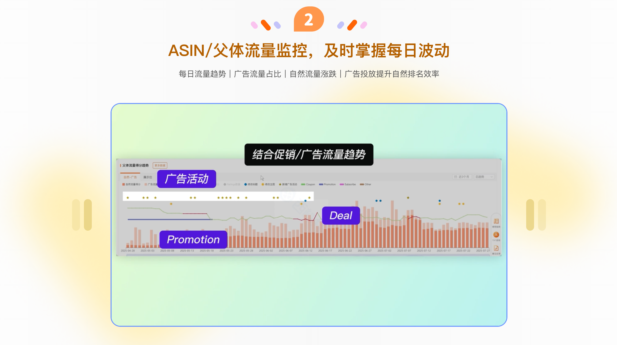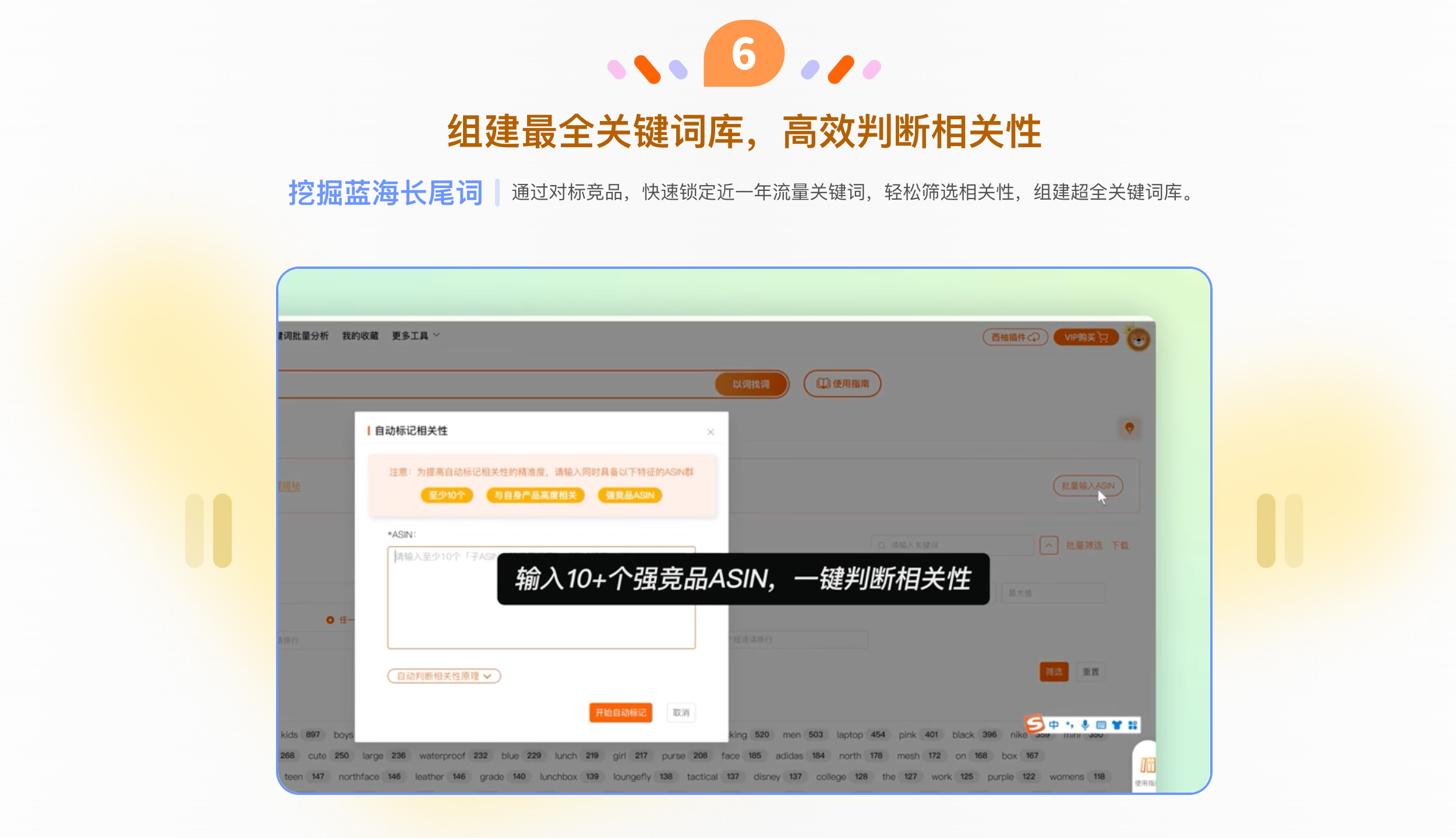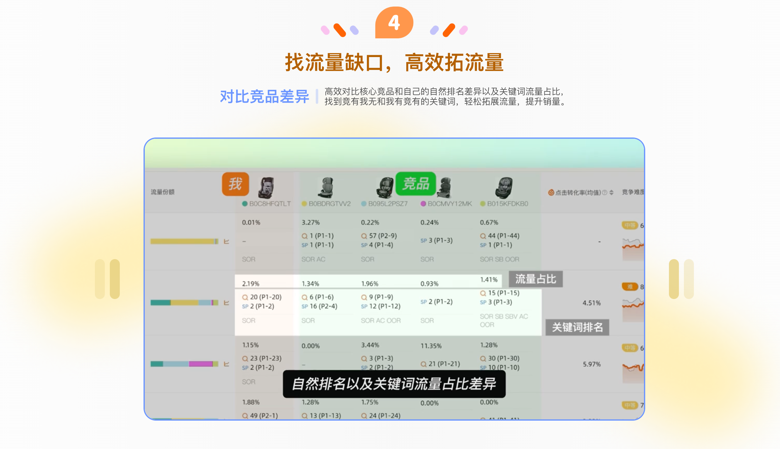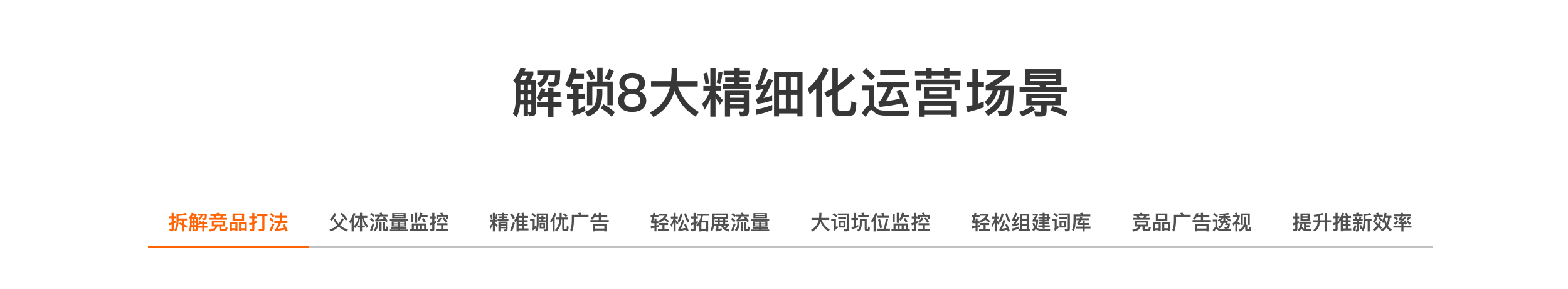 拆解竞品打法,ASIN/父体流量监控,高效拓流;轻松复盘广告效果,精准调优广告表现;核心词坑位监控,标品卖家必备;组件全关键词库,高效判断相关性;竞品广告策略透视,掌握流量分配节奏
