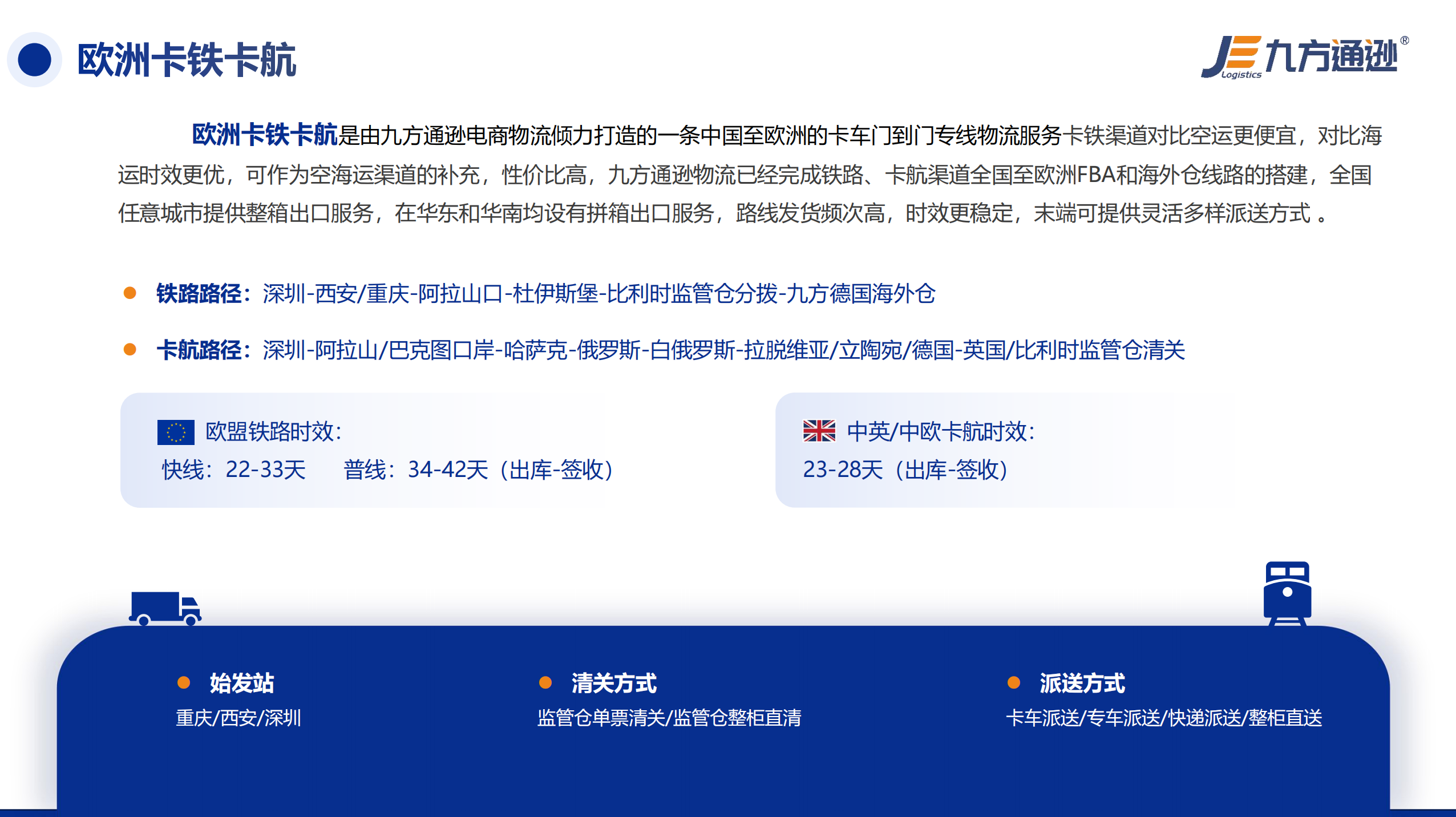 在华东和华南均设有集货拼箱出口服务;卡铁渠道对比空运更便宜,对比海运时效更优,可作为空海运渠道的补充,性价比高