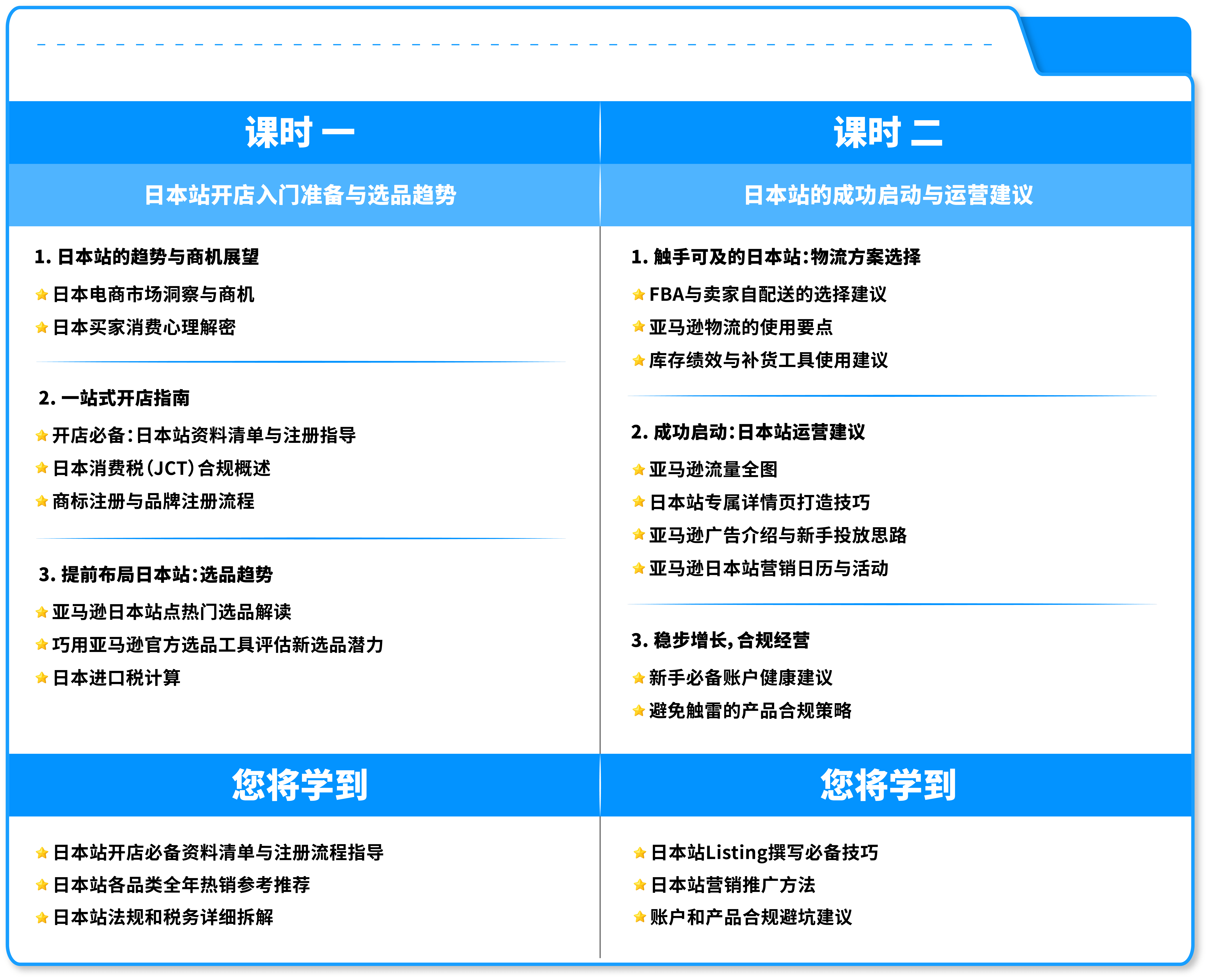 1. 日本站开店必备资料清单与注册流程指导;2. 日本站各品类全年热销参考推荐;3. 日本站法规和税务详细拆解;4. 日本站listing撰写必备技巧;5. 账户和产品合规避坑建议