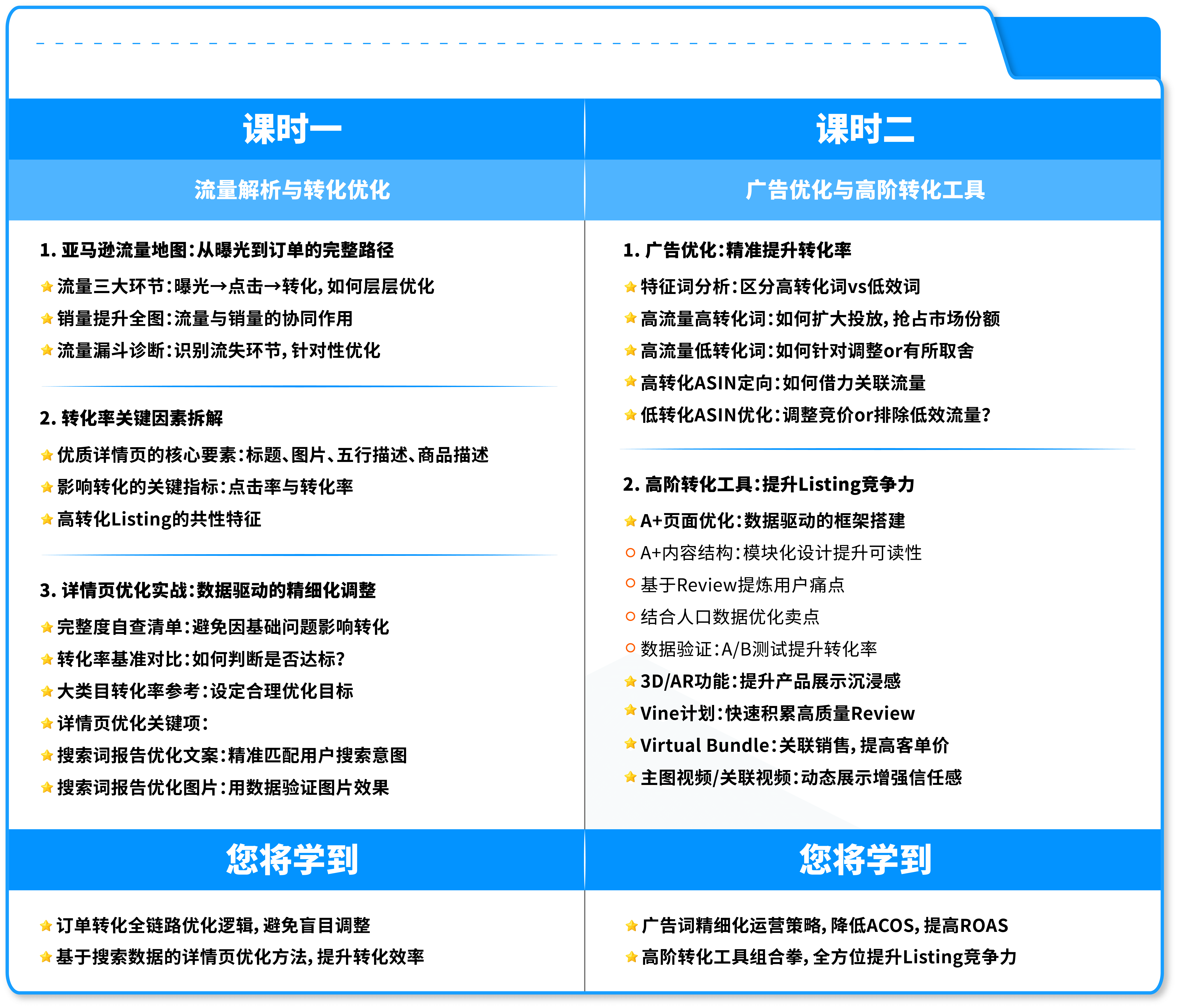 本课程系统讲解亚马逊流量运营与转化提升实战策略;涵盖流量生态构建、数据驱动优化、广告精细化调控及增效工具组合应用;形成流量精准拓展与转化效率提升的闭环管理体系