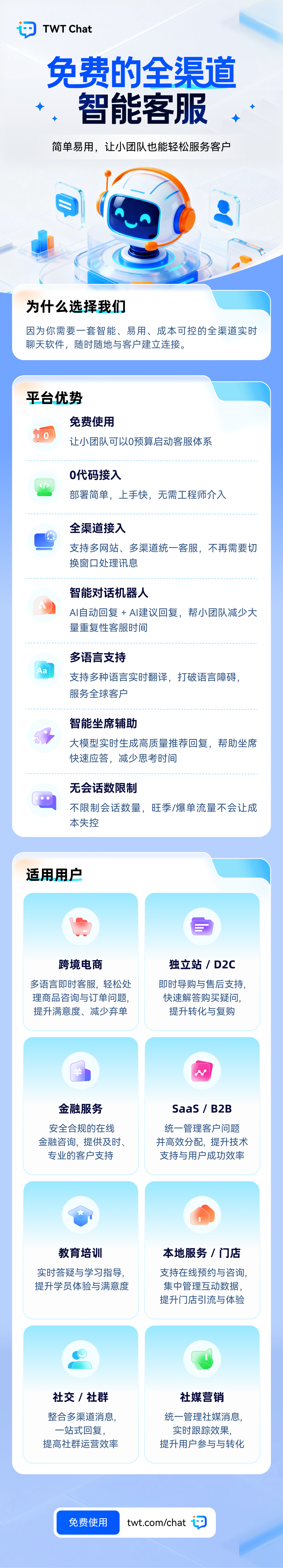 1. 免费使用,让小团队可以0预算启动客服体系;2. 不限制会话数量,旺季/爆单流量不会让成本失控;3. AI自动回复 + AI建议回复,帮小团队减少大量重复性客服时间;4. 支持自动翻译,让国际化沟通更轻松;5. 支持多网站、多渠道统一客服,不再需要切换窗口处理讯息