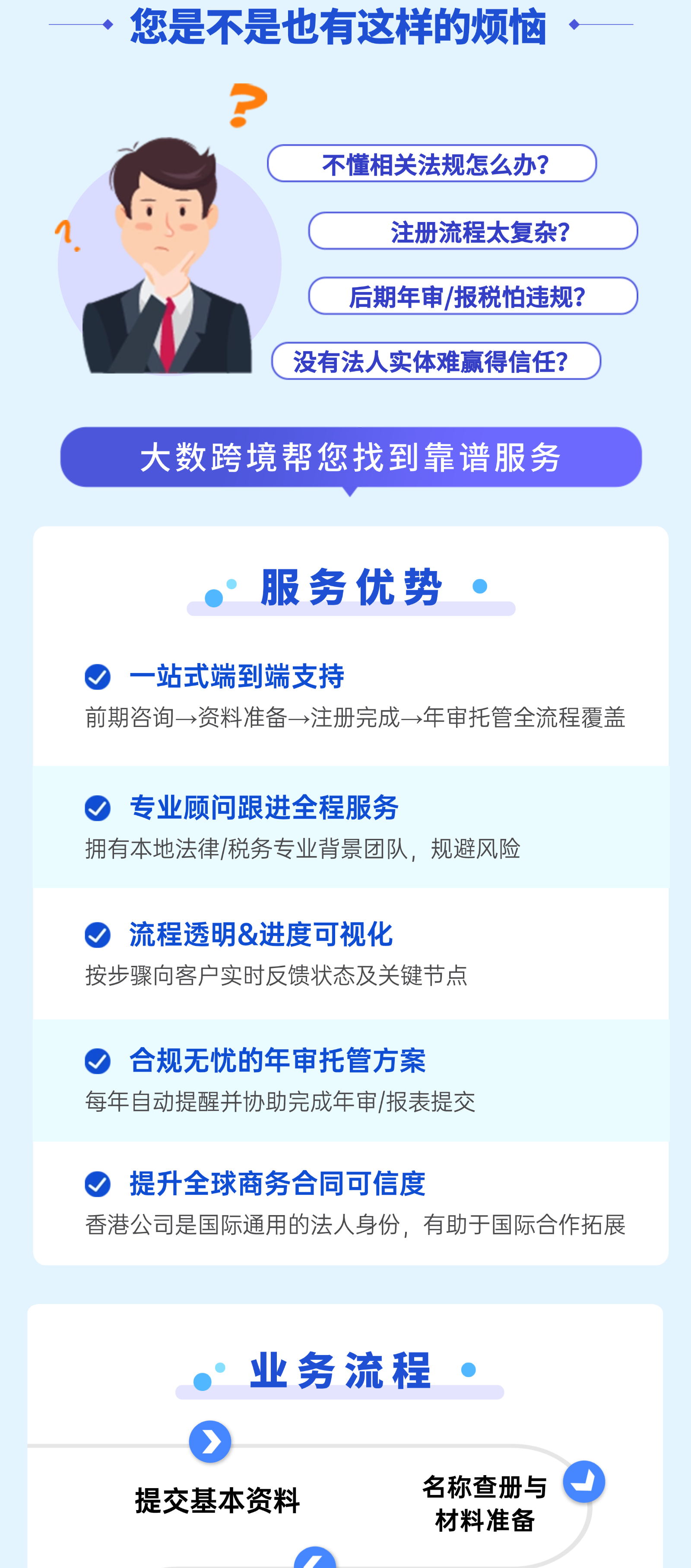 资深顾问全程对接,提供香港公司注册流程解析;根据不同跨境业务类型,提供针对性架构规划与税务优化建议。