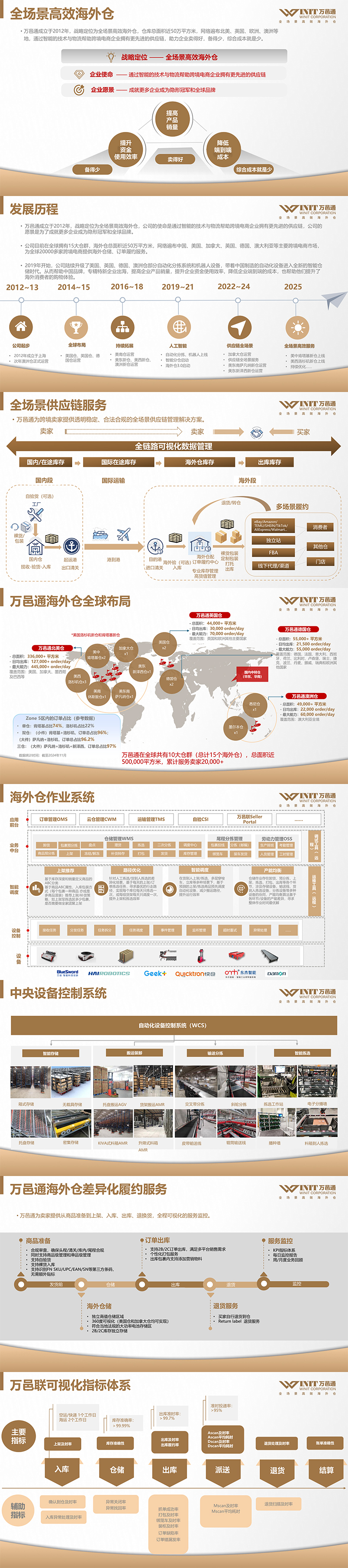 万邑通成立于2012年,作为全场景高效海外仓,仓库总面积超50万平方米,服务超20000家卖家。自建海外仓遍布北美、英国、欧洲、澳洲等地,致力于通过智能的技术与物流帮助跨境电商企业拥有更先进的供应链,陆续成为众多主流电商平台的官方认证仓。服务范围覆盖品牌消费电子,鞋服配饰等全球热卖品类;承接2B2C多渠道履约;提供灵活的品牌增值服务;对接十余家主流电商平台;提供全链路可视化的节点追踪。