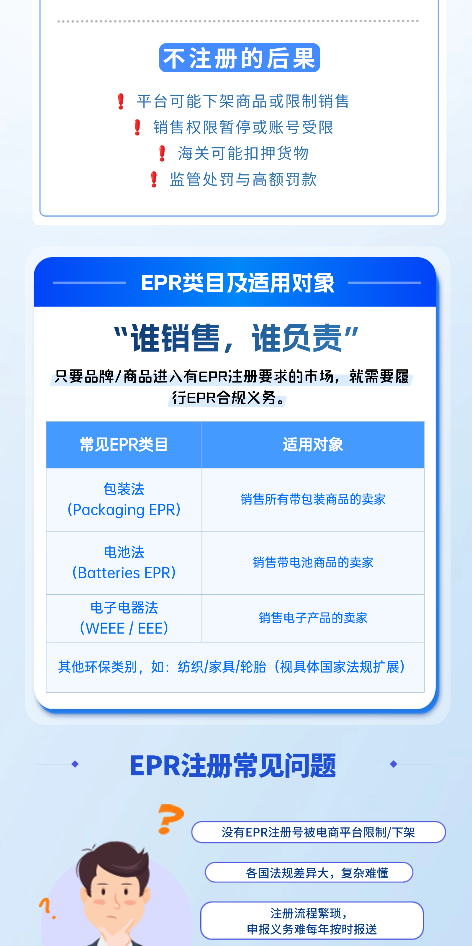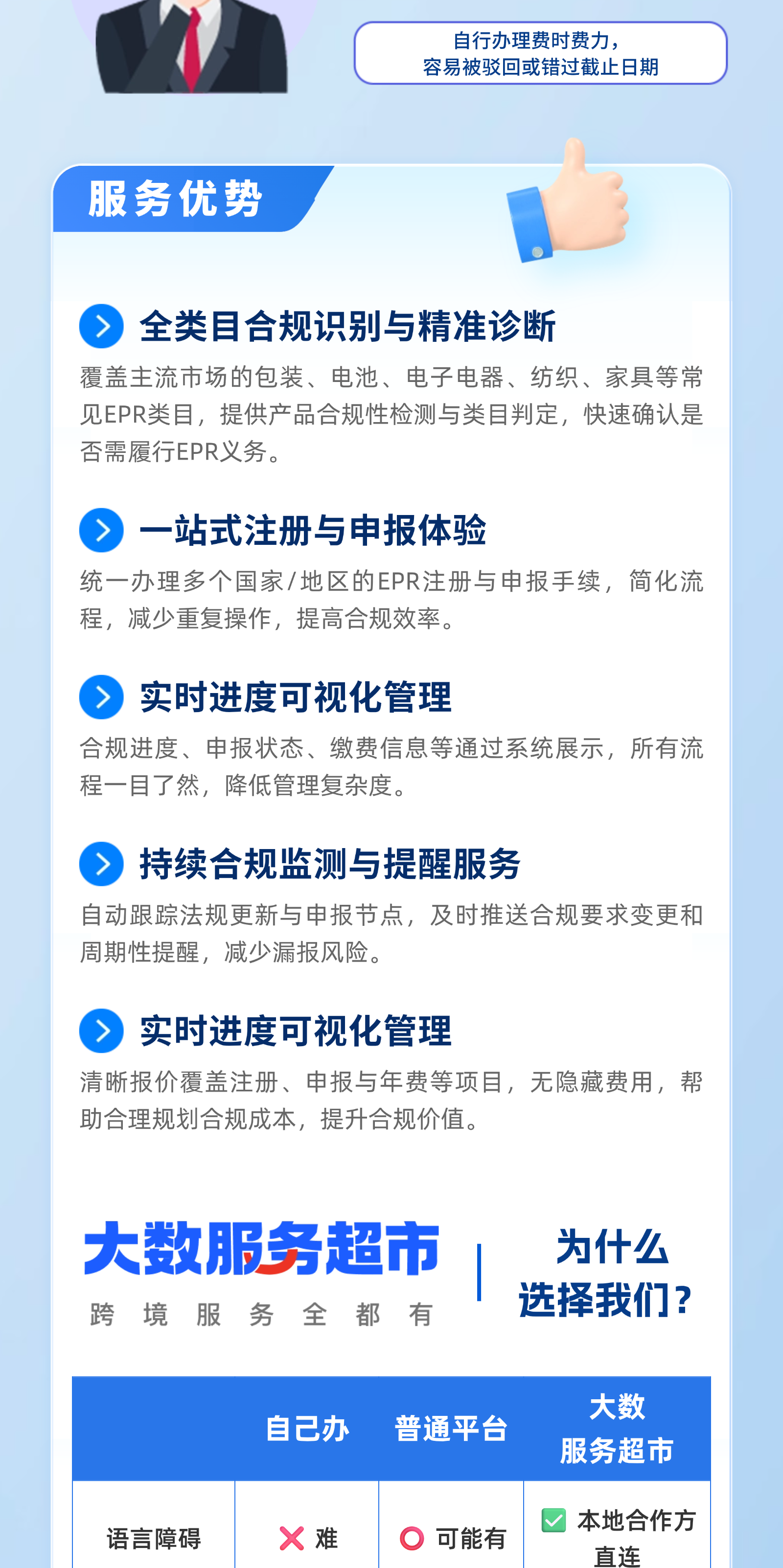 精通欧盟各国、印度等EPR法规,全面覆盖包装、电器、电池、家具、纺织品等所有类目,提供精准的合规诊断,确保无遗漏。