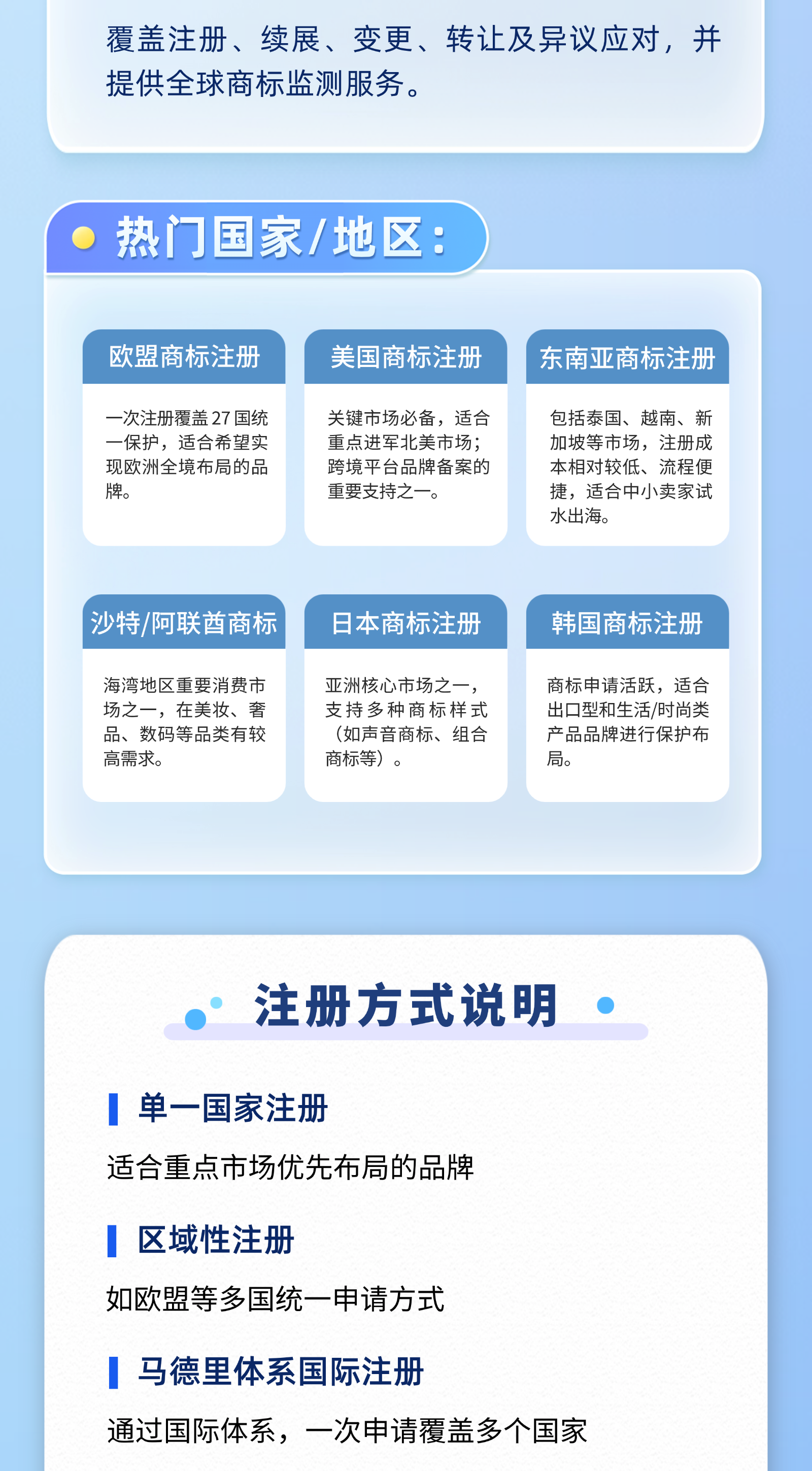 提供从注册到续展、变更、转让及异议应对的全流程管理;提供全球商标监测服务,主动预警侵权与抢注风险,实现品牌资产的动态持续保护。