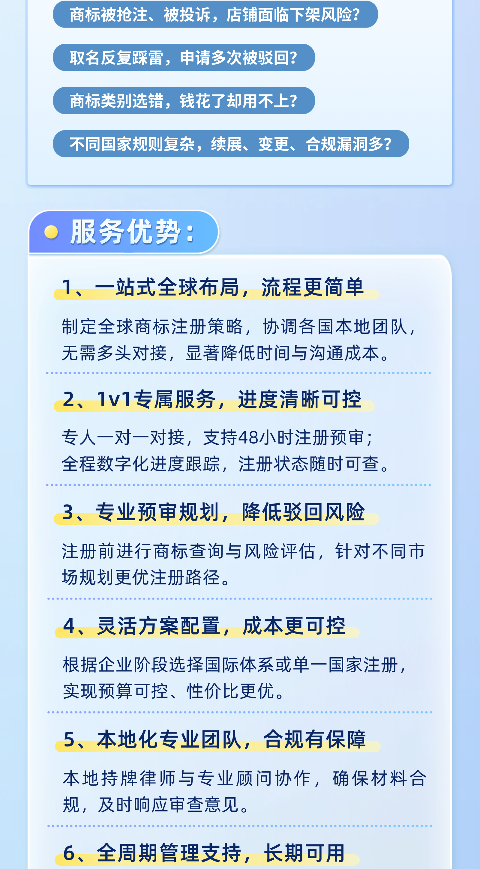 提供覆盖全球的单一窗口服务,统一制定全球注册策略并协调各国律所,无需客户逐一对接,大幅简化流程,助力高效完成全球品牌布局。