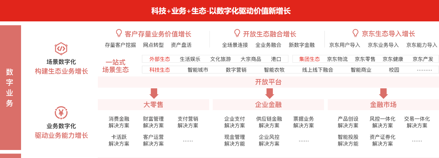 截至目前,公司完成了在数字金融、智能城市、数字农牧、数字营销、数字校园等领域的布局,旗下品牌包括京东金融、京东城市、京东农牧、京东钼媒、京东少东家等,在客户群体上实现了个人端、企业端、政府端的三端合一。