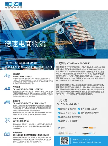 德速电商物流(广州)有限公司是一家致力于为跨境电商平台卖家提供全球物流及配套服务的跨境电商物流公司。德速电商物流连续多年获评物博会“优秀跨境电商物流服务商”荣誉称号,并成功入选运联智库“中国跨境物流50强”榜单,获评“2024引航·中国跨境物流美线FBA头程TOP10”;同时凭借专业高效的服务成为Amazon SPN 认证物流服务商、Amazon TSPN认证服务商、Amazon SEND认证承运商以及Amazon FIST认证承运商。