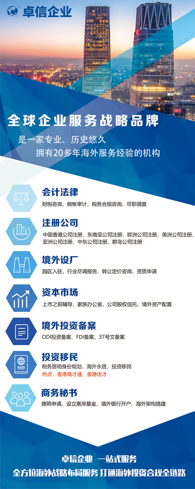 卓信企业是一家全球化运营的专业商务服务机构。业务覆盖中国大陆13个城市,并在香港、新加坡、泰国、迪拜、印尼、沙特及土耳其等地设立了分支机构。集团旗下拥有咨询公司、秘书公司、会计师事务所、税务咨询公司等多个专业服务平台,均获得当地权威资质认证。专业提供海外公司注册、境外银行开户、海外公司年审审计等。