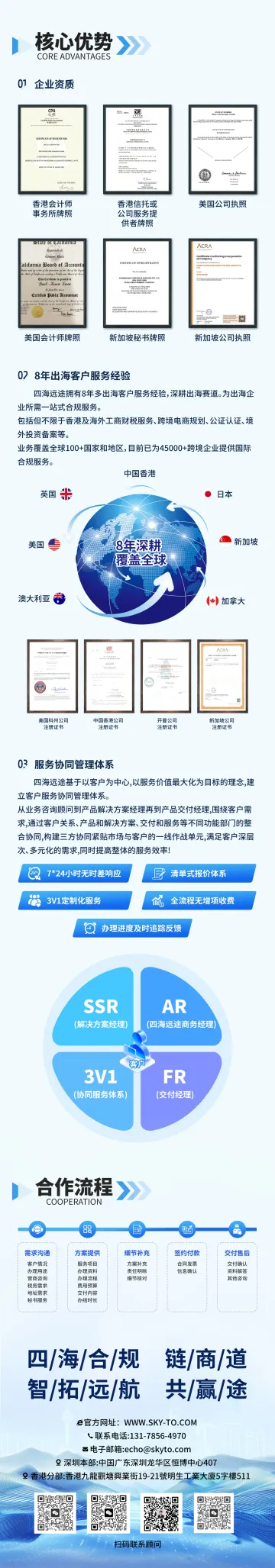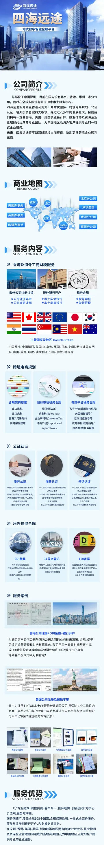 总部位于中国深圳,目前在国内设有北京、香港、惠州三家分公司,同时在全球多国设有超过30家本土服务机构。业务涵盖香港及海外工商财税服务、跨境电商规划、公证认证、境外投资备案四大板块。经过近八多年的发展壮大,目前拥有一支由香港、美国、英国执业会计师,执业律师及资深企业管理顾问组成的专业团队,为中国地区及海外客户提供专业的一站式企业服务。