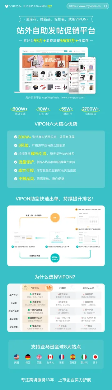VIPON的核心优势本质是“低成本、高灵活、强合规”的站外引流解决方案,尤其适合需要快速清库存、推新品、稳排名的卖家,同时规避了站内广告(ACOS高)和刷单(封店风险)的弊端。