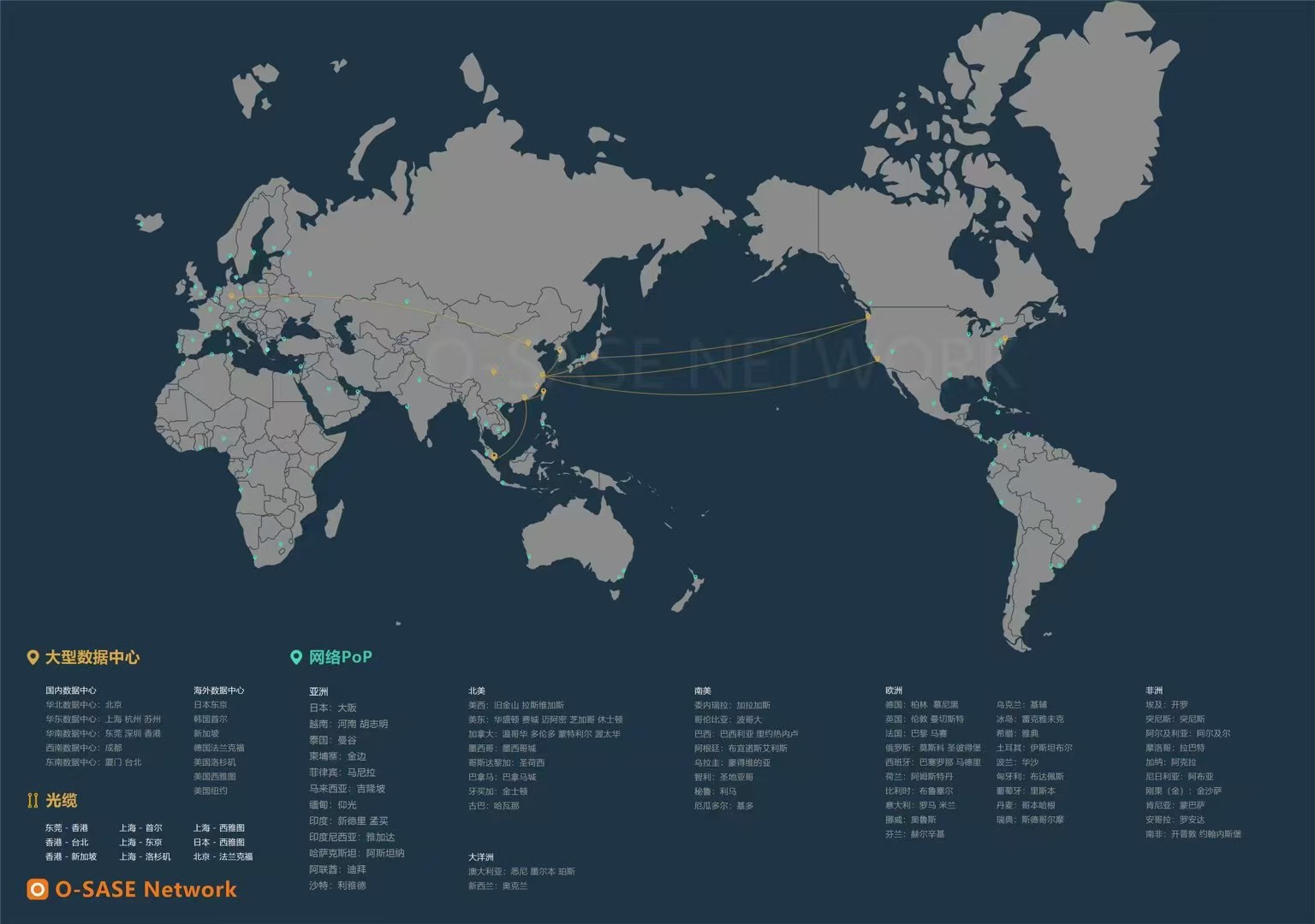 跨境网络专线:依托自研SD-WAN核心技术,O-SASE 提供全球应用与办公服务加速,提供合规跨境专线功能,帮助企业合法合规网络出海,快速稳定地访问境外网站,开展海外业务。