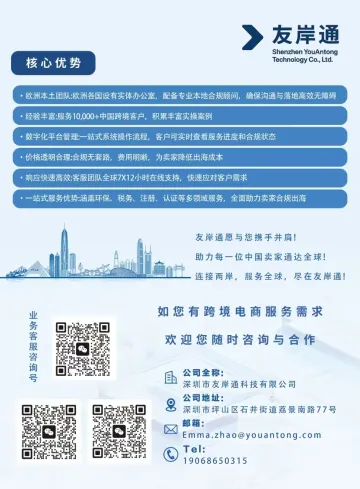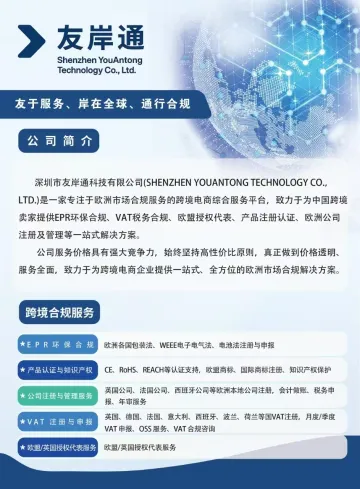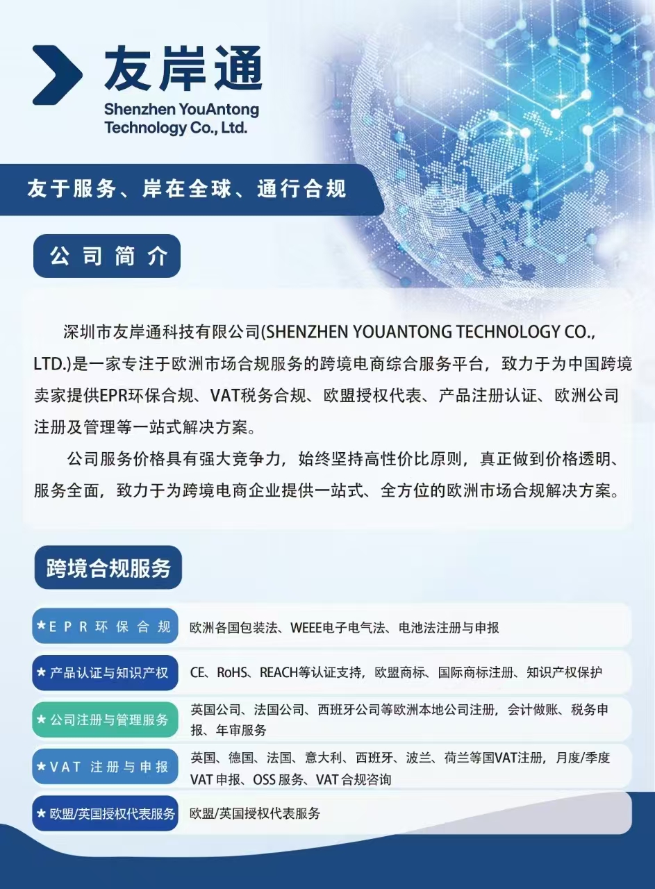 深圳市友岸通科技有限公司(SHENZHEN YOUANTONG TECHNOLOGY CO., LTD.)是一家专注于欧洲市场合规服务的跨境电商综合服务平台,致力于为中国跨境卖家提供EPR环保合规、VAT税务合规、欧盟授权代表、产品注册认证、欧洲公司注册及管理等一站式解决方案。