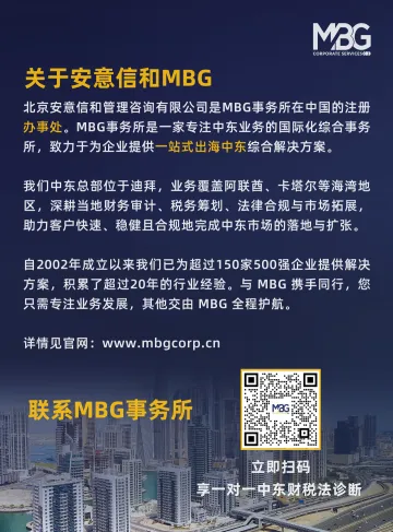 北京安意信和管理咨询有限公司是MBG事务所在中国的注册办事处。MBG事务所是一家专注中东业务的国际化综合事务所,致力于为企业提供一站式出海中东综合解决方案。我们成立于2002年,中东总部位于迪拜,业务覆盖阿联酋、卡塔尔等海湾地区,深耕当地财务审计、税务筹划、法律合规与市场拓展,助力客户快速、稳健且合规地完成中东市场的落地与扩张。自2002年成立以来我们已为超过150家500强企业提供解决方案,积累了超过20年的行业经验。