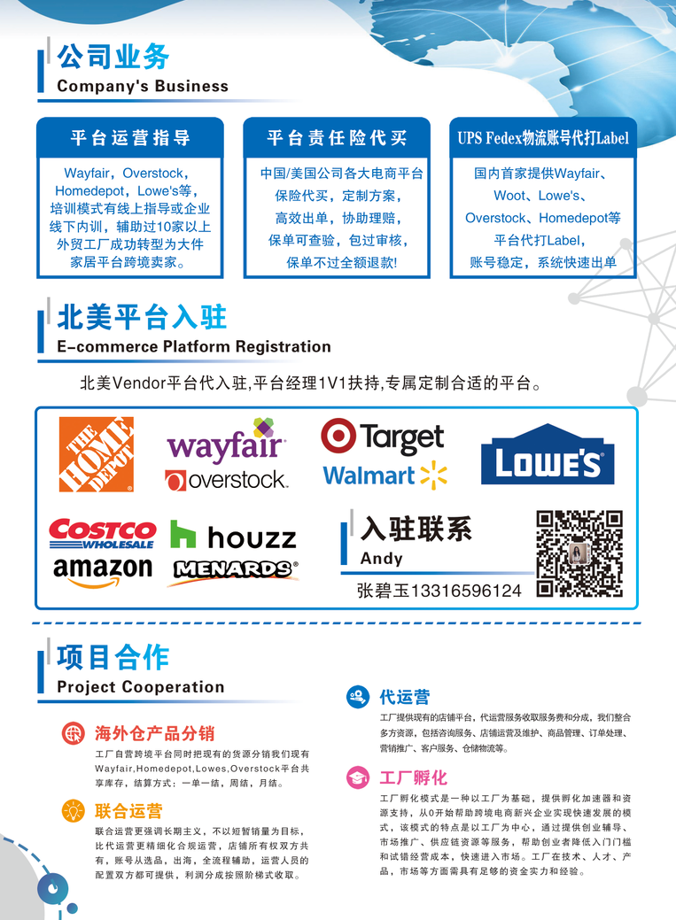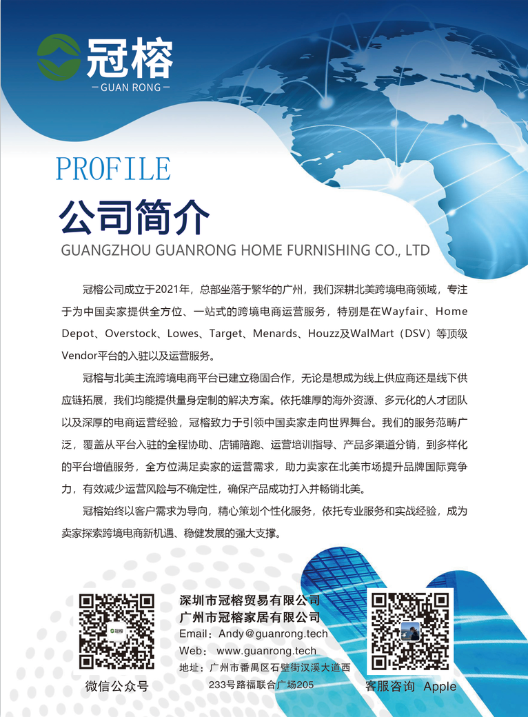 冠榕公司成立于2021年,总部坐落于繁华的广州,我们深耕北美跨境电商领域,专注于为中国卖家提供全方位、一站式的跨境电商运营服务, 特别是在Wayfair,HomeDepot, Overstock, Lowes, Target, Menards, Houzz及WalMart (DSV) 等