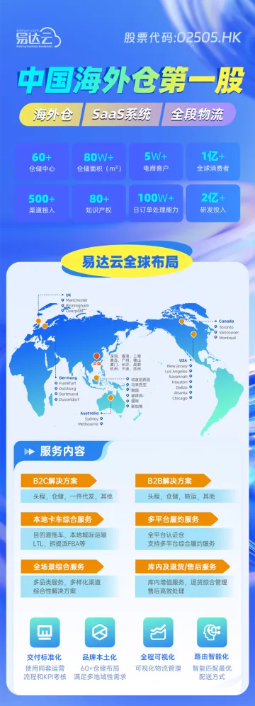 易达云科技集团在美国、英国、加拿大、澳大利亚、德国等国家投资建设海外仓网络,总仓数超60座,总面积超过 60 万平方米。易达云科技荣膺国家高新技术企业,并以超30%研发投入深耕全球数字化供应链创新,搭建跨境电商供应链服务平台。在技术研发上获得国家几十项发明专利、实用新型专利以及项软件著作权。