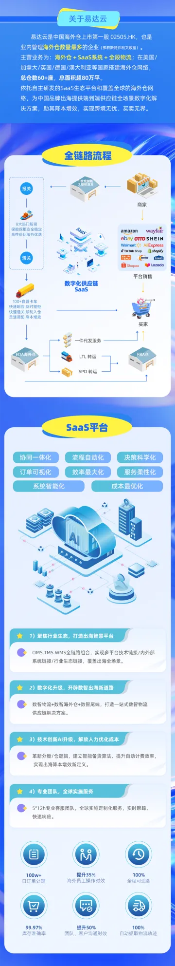 易达云科技集团是一家专注于跨境电商服务的互联网科技公司,公司通过多年全球海外仓布局,依托自主研发的SAAS平台,打通端到端国际物流运输服务,为跨境电商、物流服务商、仓储服务商等生态合作伙伴创造价值,助力其降本增效,实现跨境无忧、买卖无界。