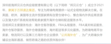 邦贝云仓是万邦集团旗下的新成立的供应链管理公司,专注于构建全球领先的数字化转运海外仓体系。他们在英国、欧洲、美国等主要外贸国家设立了自营仓储中心,并整合了海内外供应商资源和强大的IT系统,致力于提升卖家的海外仓储和配送服务水平。