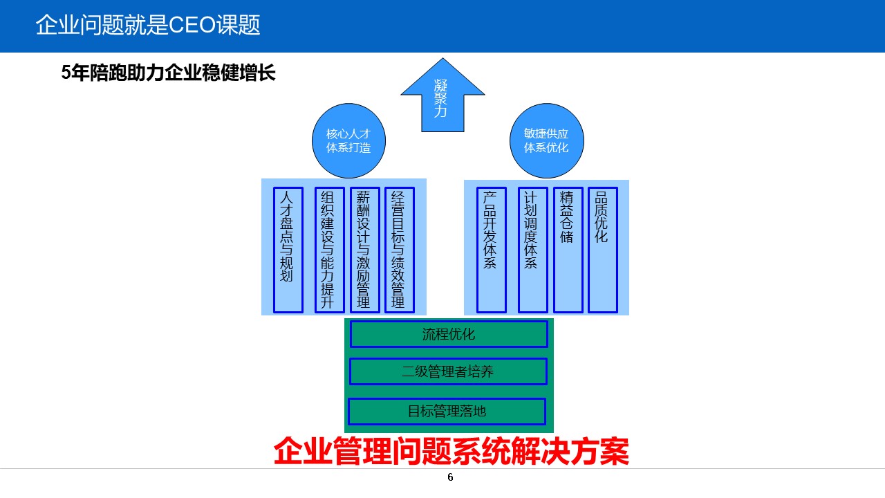 通过多年行业实践,构建了独特的行业管理模型,让经营者在决策与管理上可以通过指标、数据说话,改善效果、评估测量上可以实现量化管理。通过对多年精益管理现场实践的高度总结,提出了“简单管理”理论和实践方法,帮助企业摆脱“复杂”病,让其运营组织变得健康敏捷、快速流畅。对标各行业先进管理经验,通过大量行业实践案例的梳理、总结与提炼,提出与行业高度契合的管理模型与整体解决方案。并根据不同经营组织特点、不同经营形态与经营现状、匹配企业不同发展阶段,高度锲合客户需求,专门针对成长型企业设计个性化解决方案。
