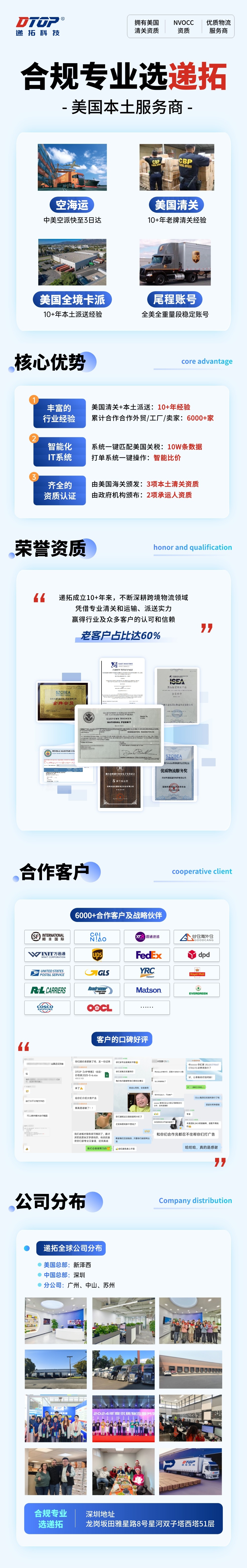 递拓科技成立于2014年,为外贸、工厂及跨境电商企业提供美国清关、空海运、美国全境卡派、尾程账号等业务。