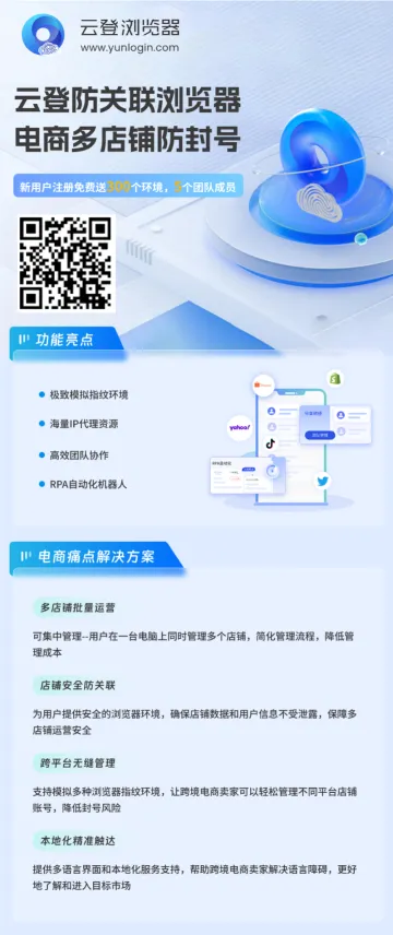 而云登指纹浏览器专为 跨境电商、社媒矩阵、品牌营销、多账号团队运营 场景而生。 — 它是辰链自主研发、拥有完全自主知识产权的跨境电商“多店铺防关联 & 安全运营”平台。